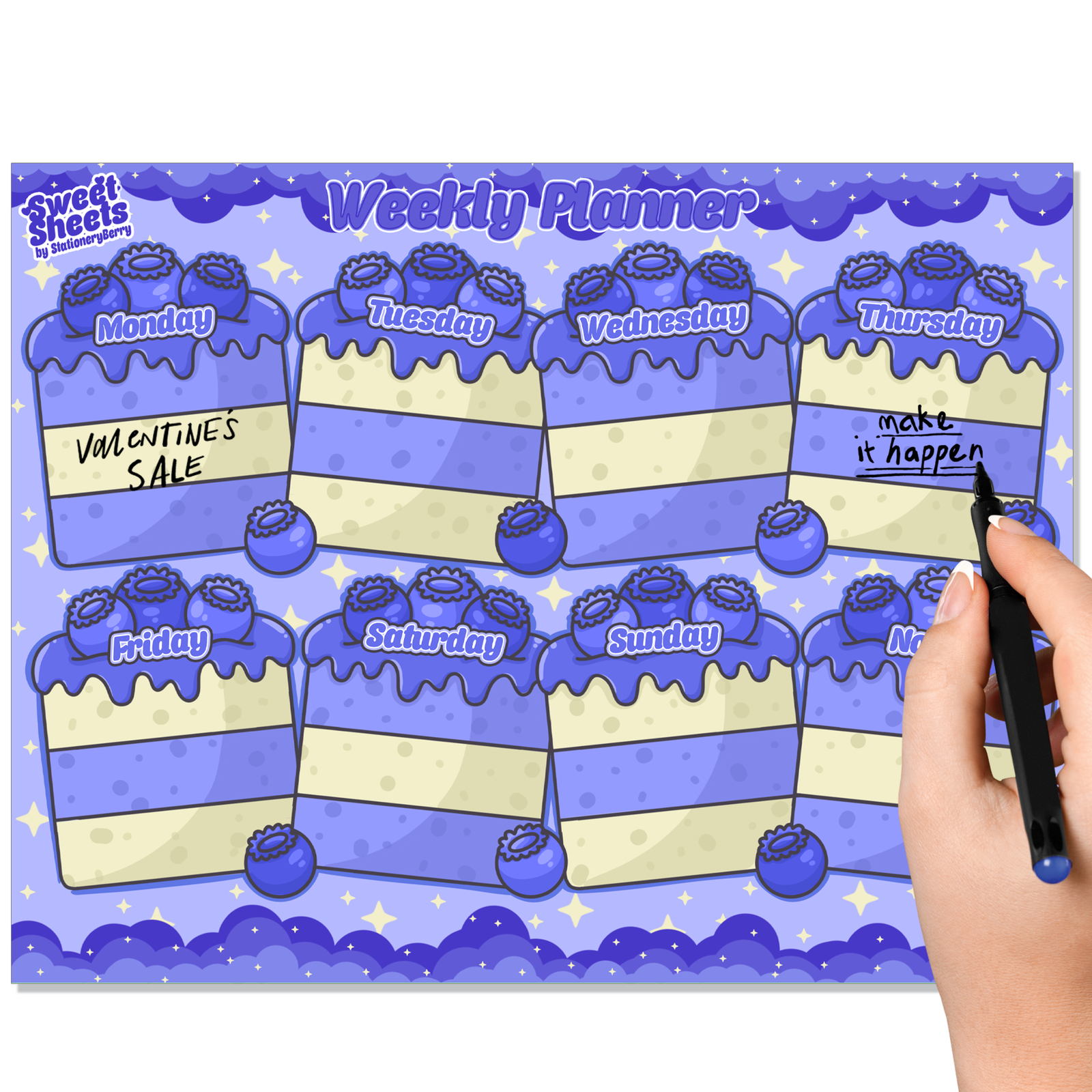 Each page features a charming dark and light blue background filled with illustrated slices of blueberry cake, which serve as the sections for the days of the week. Every piece of cake is topped with luscious strawberries, adding pops of red and a sense of indulgent sweetness to the design. This creative layout transforms the traditional Monday–Sunday format into a fun visual experience that feels more like dessert than a schedule. A notes section is included for reminders, to-do lists, or extra thoughts that don’t fit into the daily boxes. At the bottom of the page, illustrated blueberries can be used to write the date, adding a unique and interactive detail to each week.