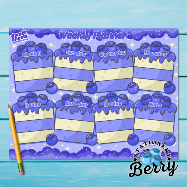 Sweet, calming, and full of charm, the Blissful Blueberry Weekly Planner Pad from the Sweet Sheets Collection turns your weekly planning into a dessert-inspired delight. With rich blue tones and adorable slices of blueberry cake topped with strawberries, this planner pad blends cozy sweetness with practical organization.