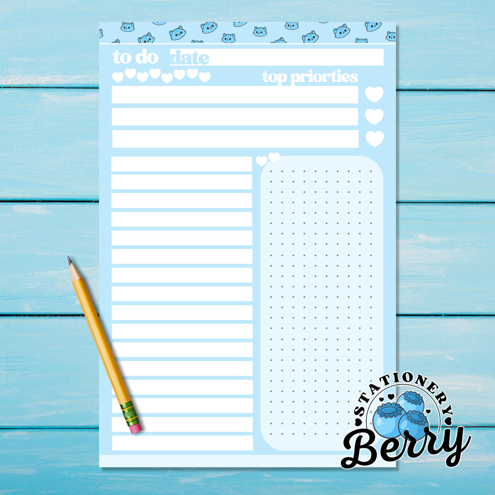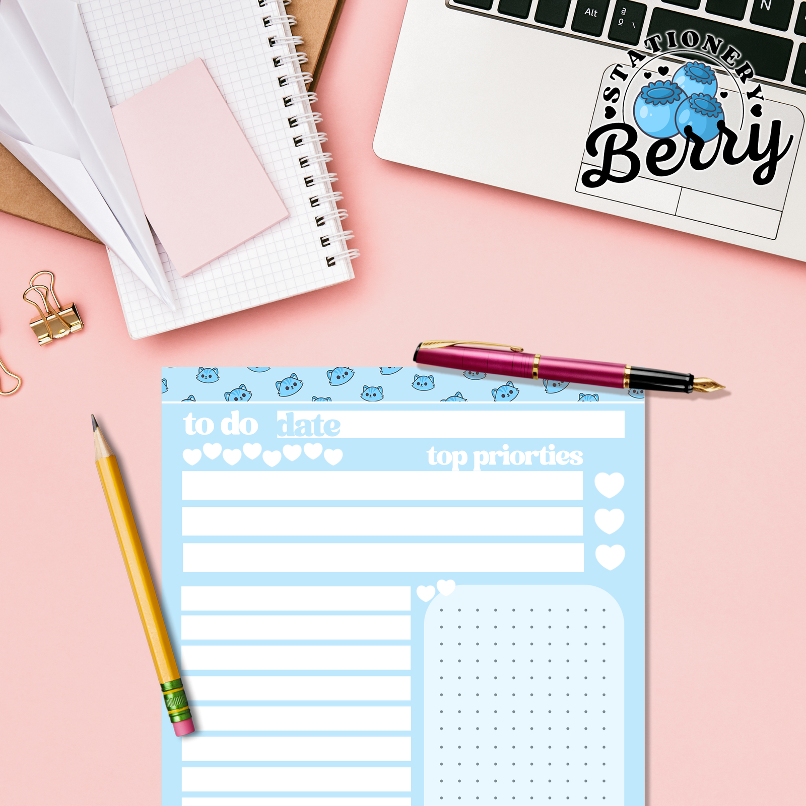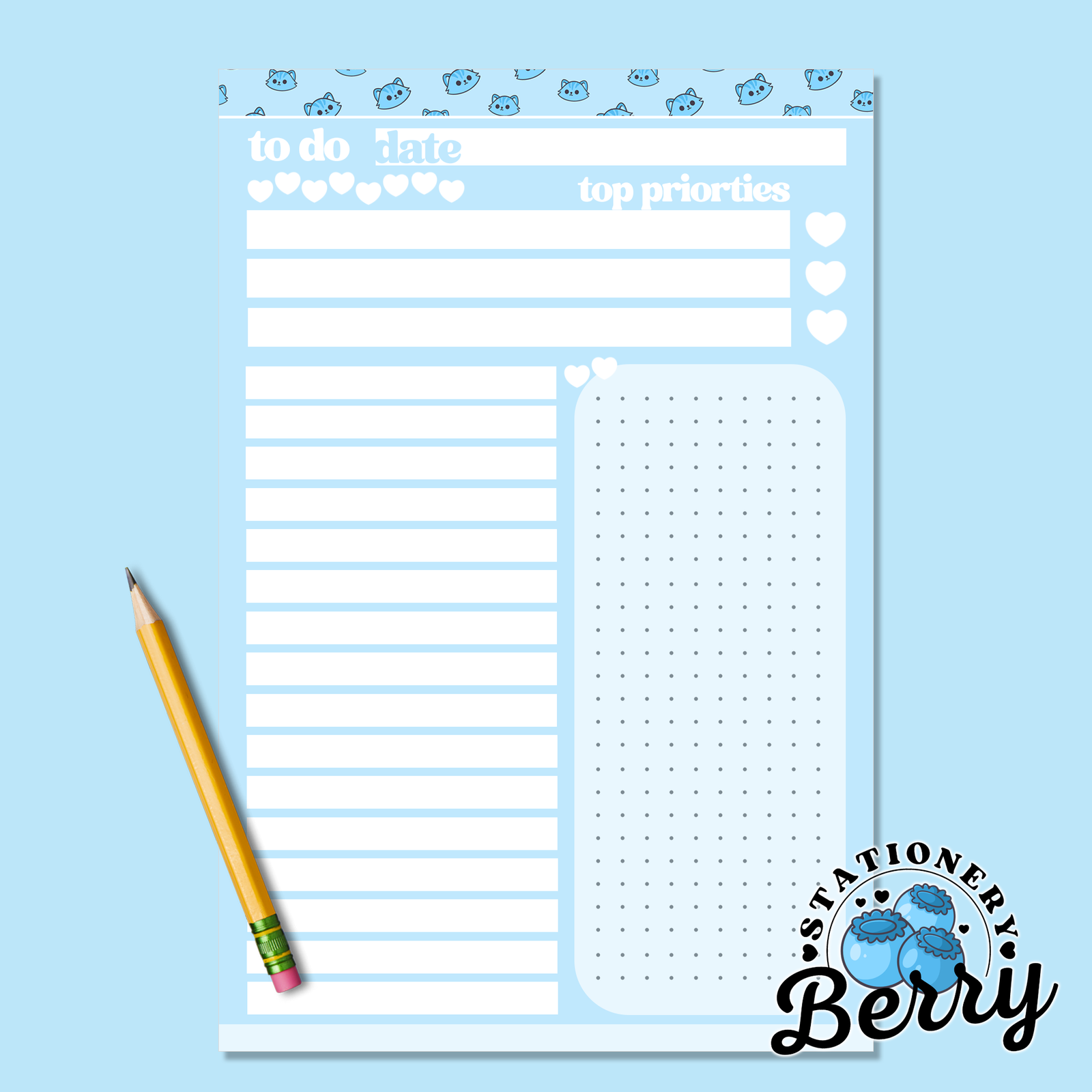 Below the priorities, the dotted area provides flexible room for custom information. Use it for notes, reminders, meal plans, or small doodles to personalize your list. Underneath, 16 lined rows give you plenty of space for all the other things you need to do, from errands and chores to creative projects and study tasks. The blue background is soft and calming, while the blueberry kitty pattern at the top adds just the right amount of fun without distracting from your writing.