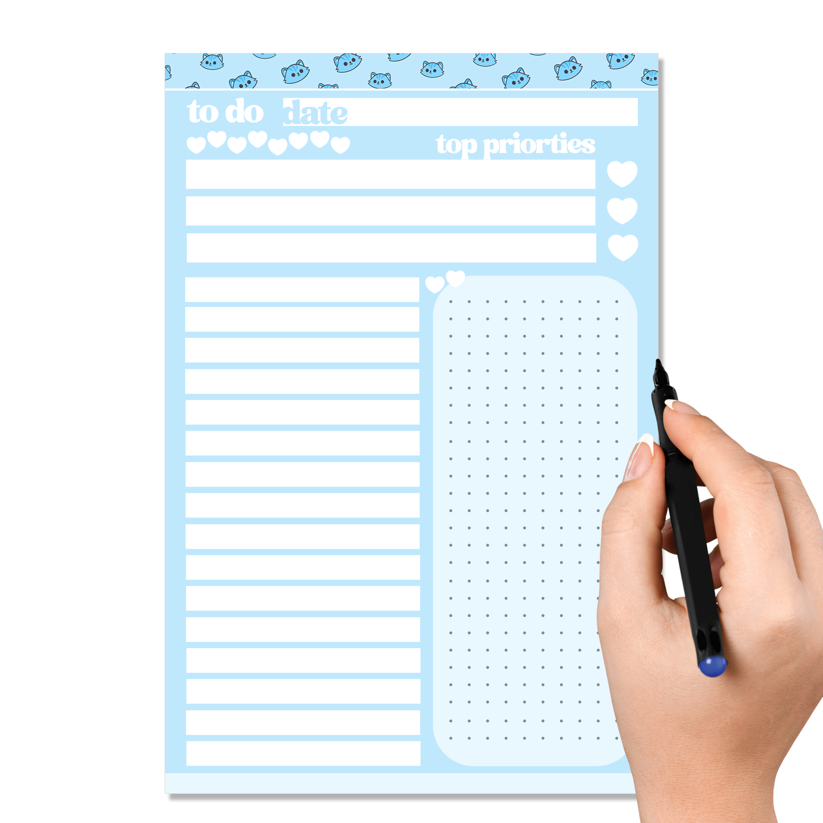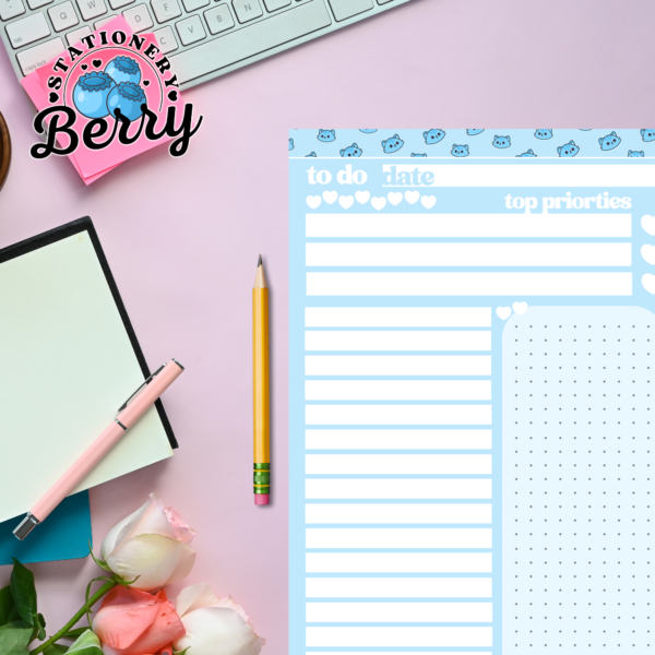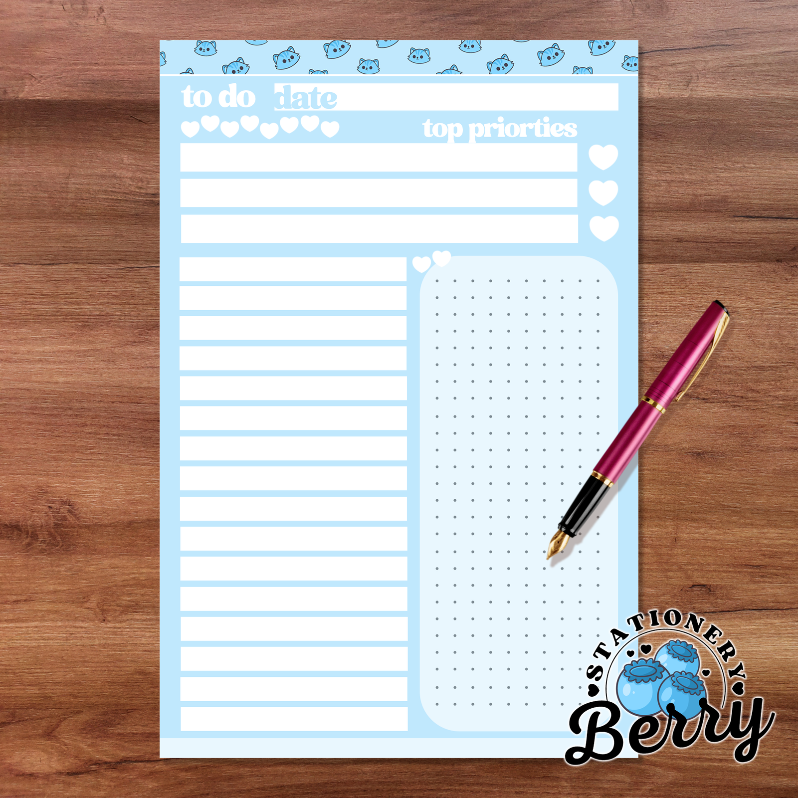 Below the priorities, the dotted area provides flexible room for custom information. Use it for notes, reminders, meal plans, or small doodles to personalize your list. Underneath, 16 lined rows give you plenty of space for all the other things you need to do, from errands and chores to creative projects and study tasks. The blue background is soft and calming, while the blueberry kitty pattern at the top adds just the right amount of fun without distracting from your writing.