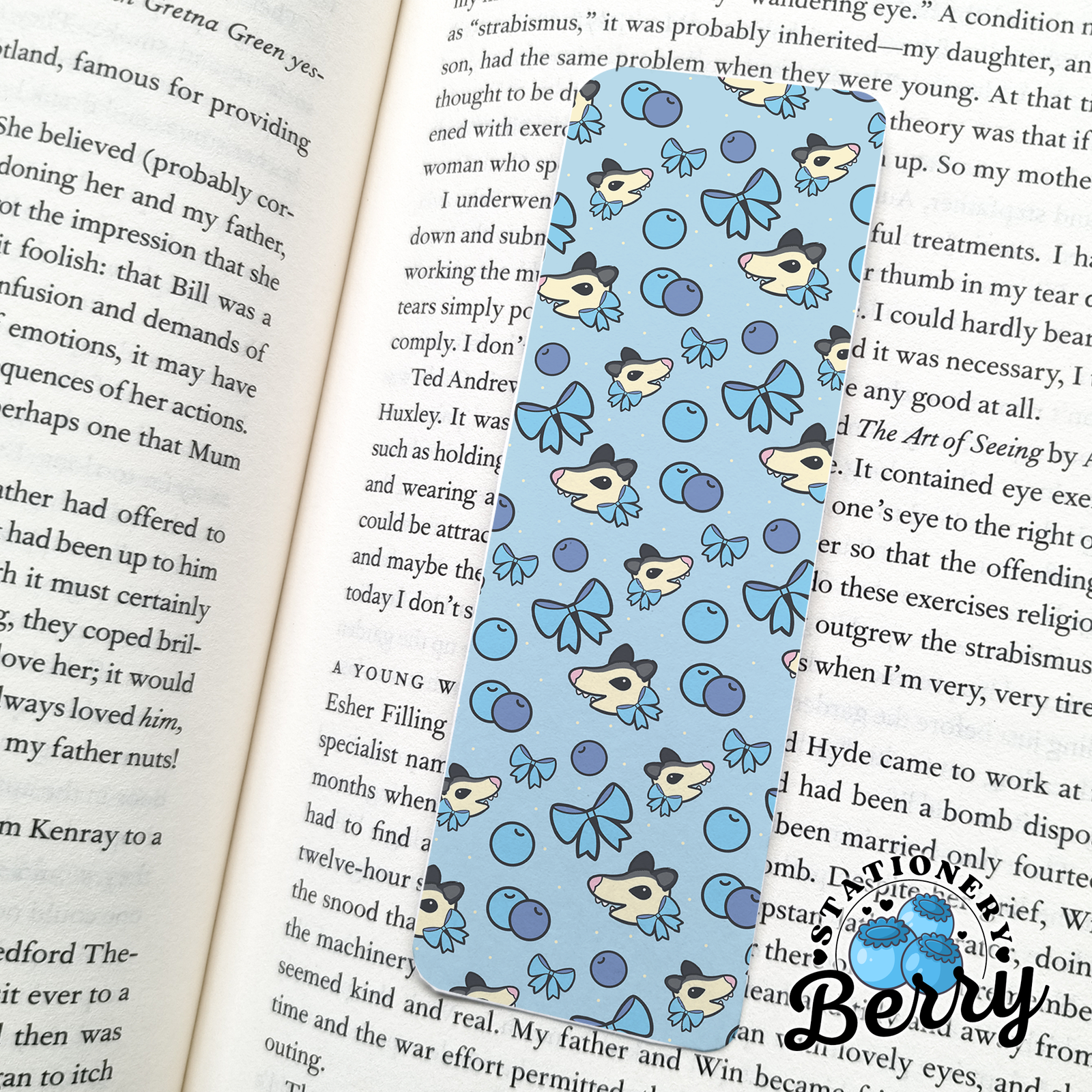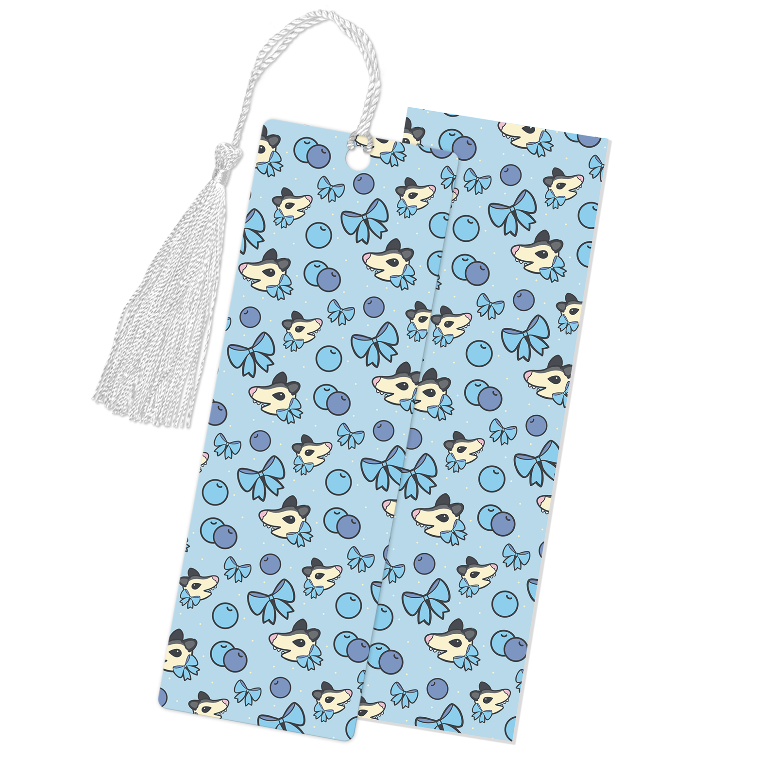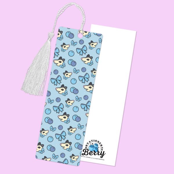 The Blueberry Possum Bookmark features possums, bows, and blueberries on a blue background and is handmade with hand-drawn artwork by Becca Bleu.