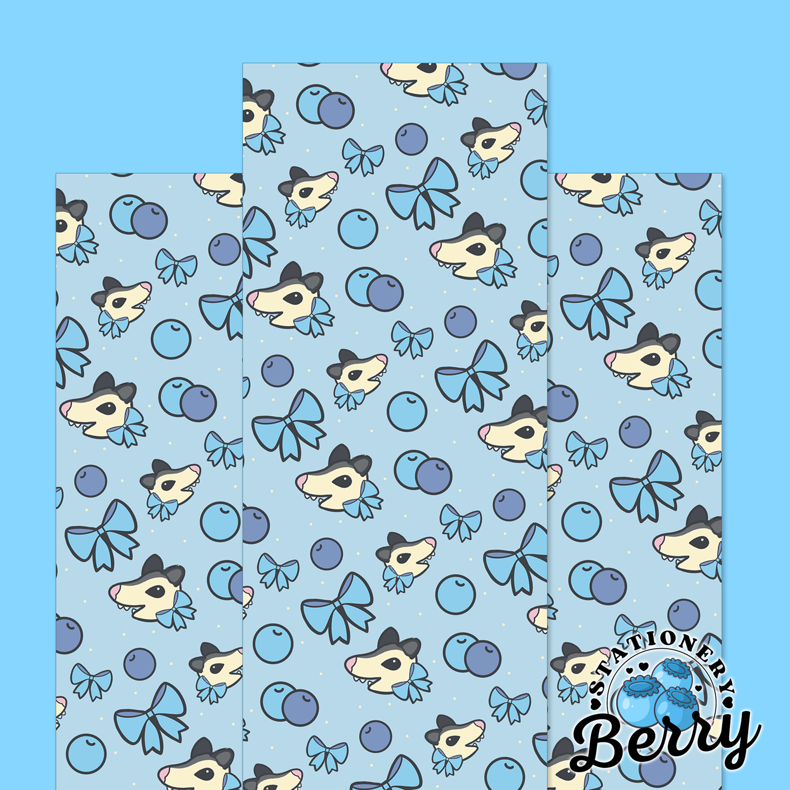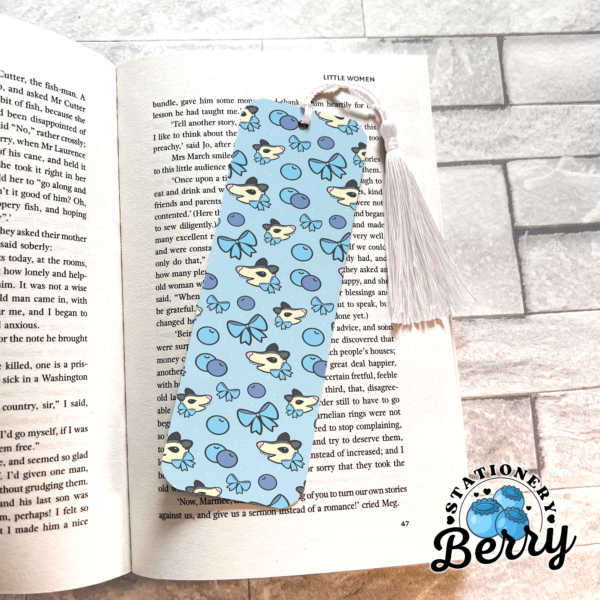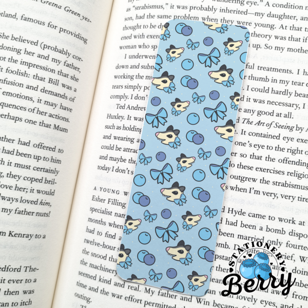 The Blueberry Possum Bookmark is a cute and cozy reading accessory featuring playful possums, sweet bows, and juicy blueberries on a soft blue background. With its hand-drawn artwork and handmade quality, this bookmark is perfect for readers who love whimsical animal designs and charming stationery.