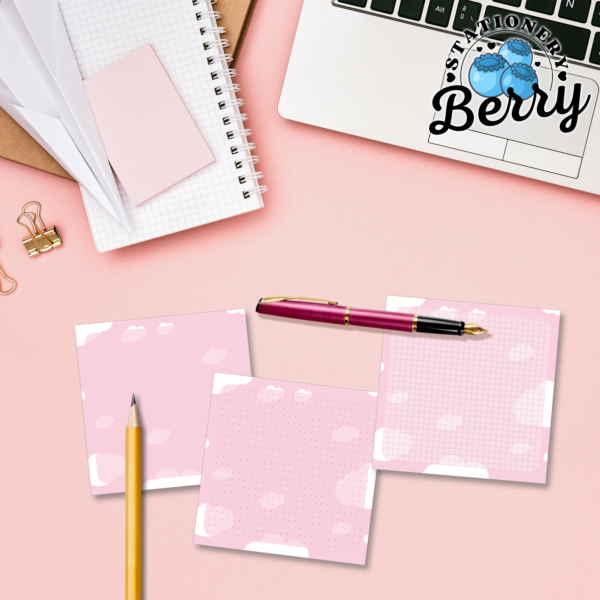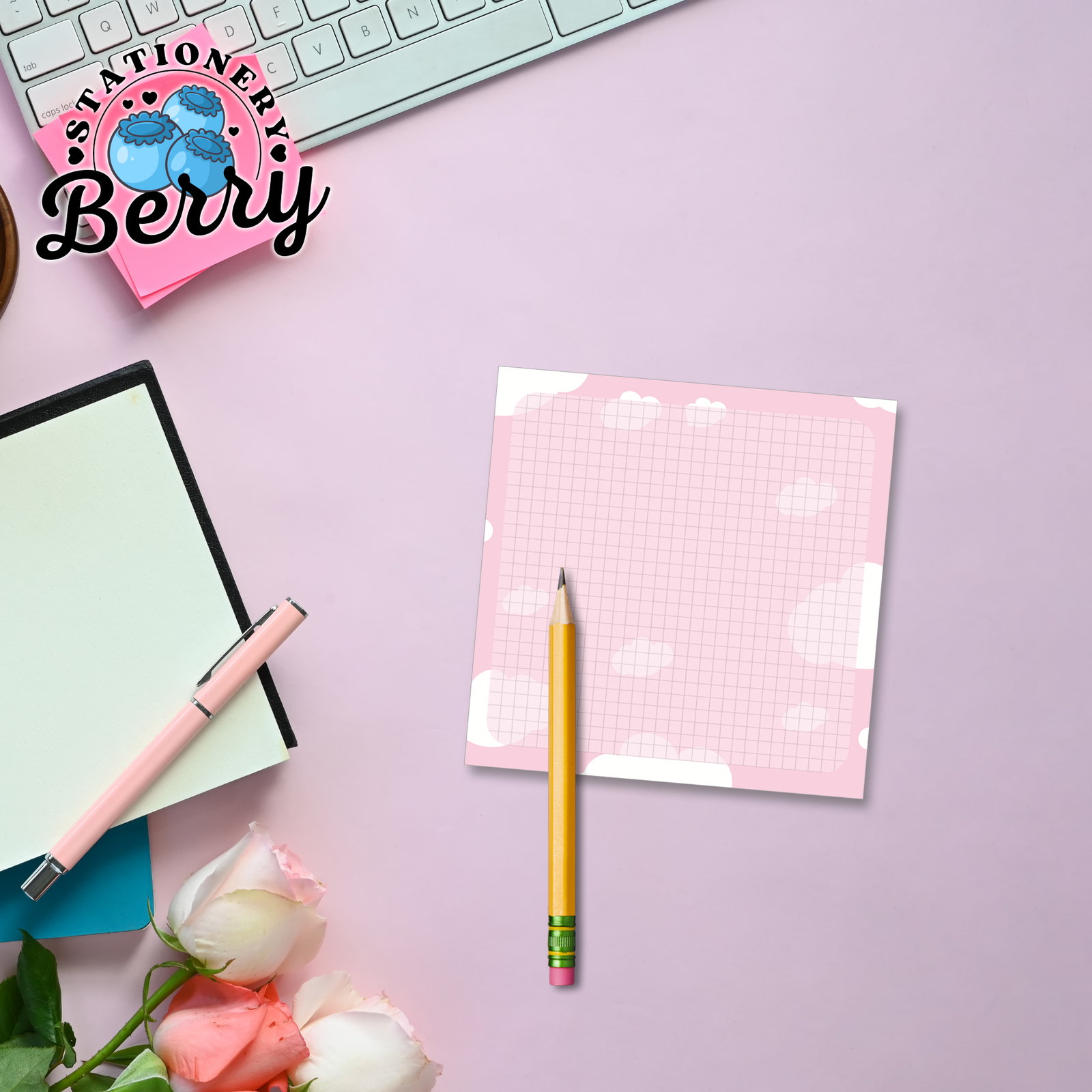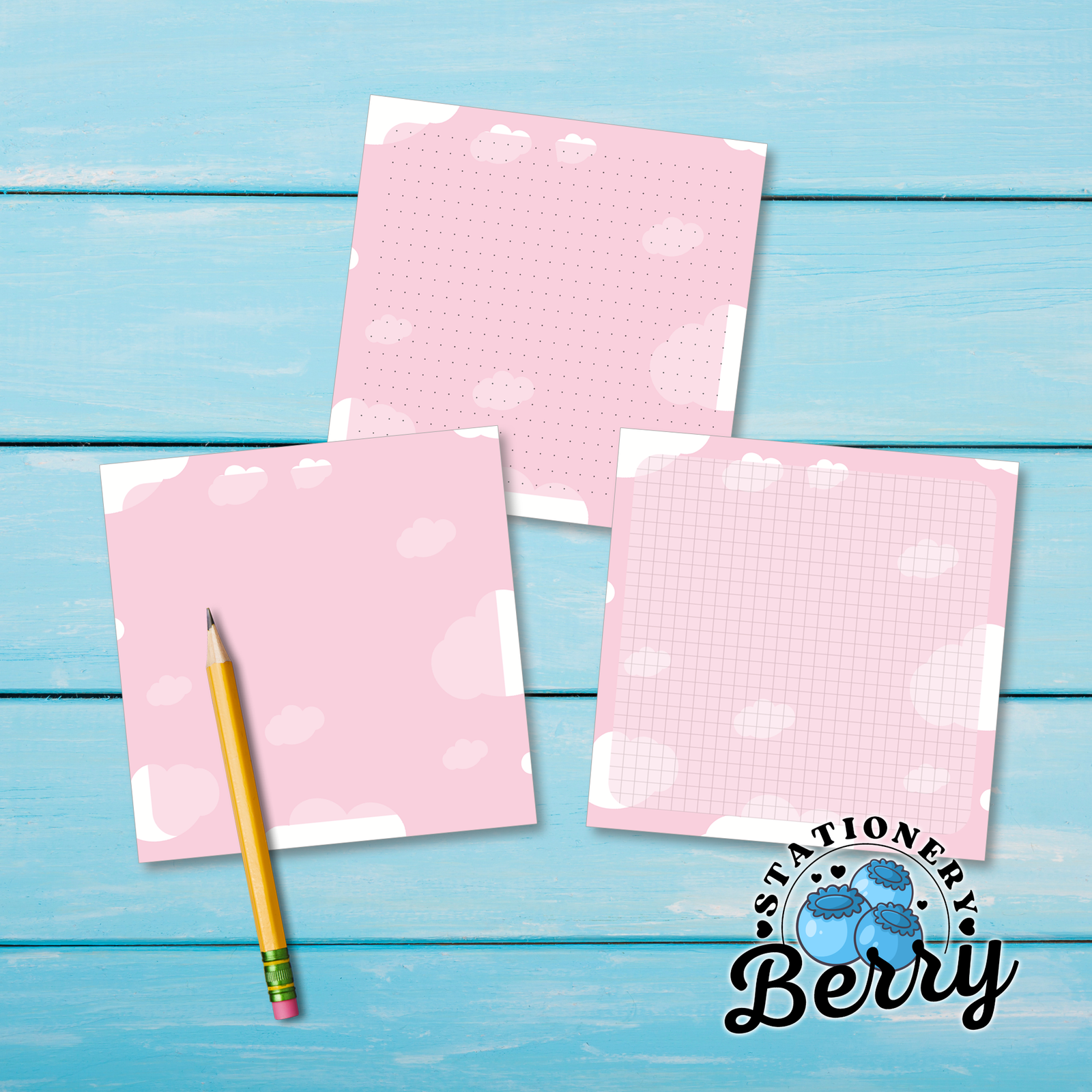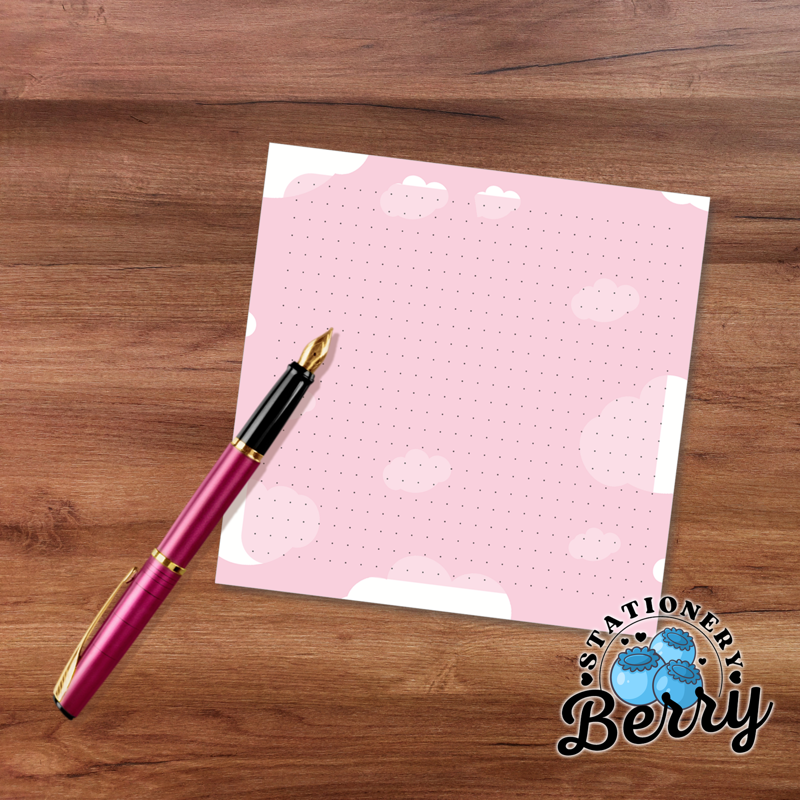 The Clouds Pink Memo Pad is a handmade 4×4 memo pad featuring white clouds on a pink background. Available in dot, blank, grid, or bundle styles.