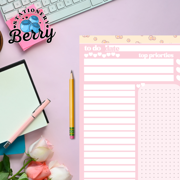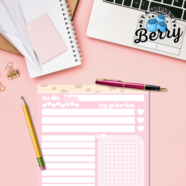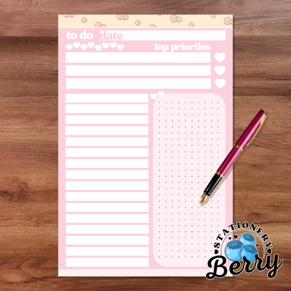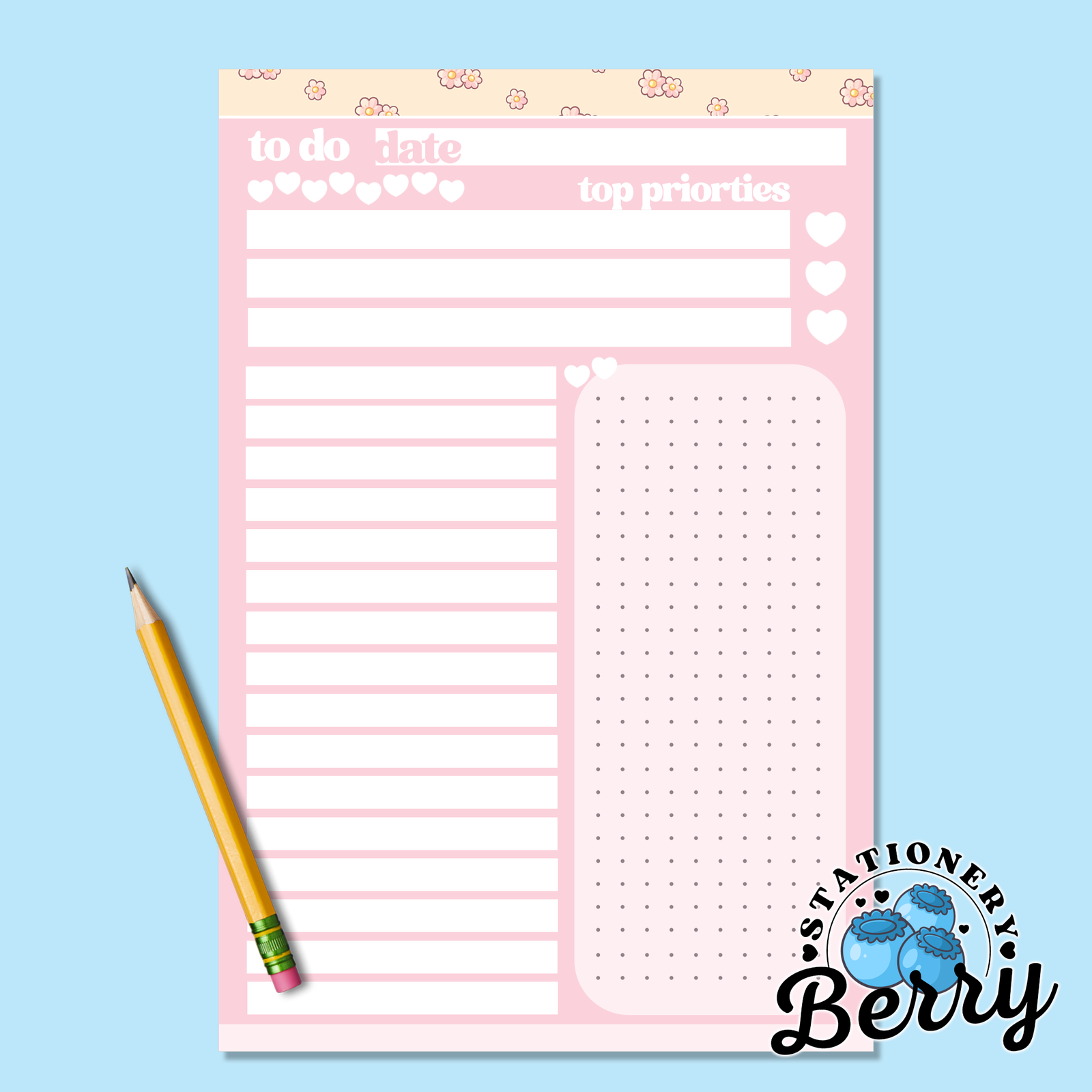 The Cute Daisies Cream To Do Pads feature priorities, dots, and lines on a pink background with soft daisy artwork. Cute, functional, and handmade with original design.