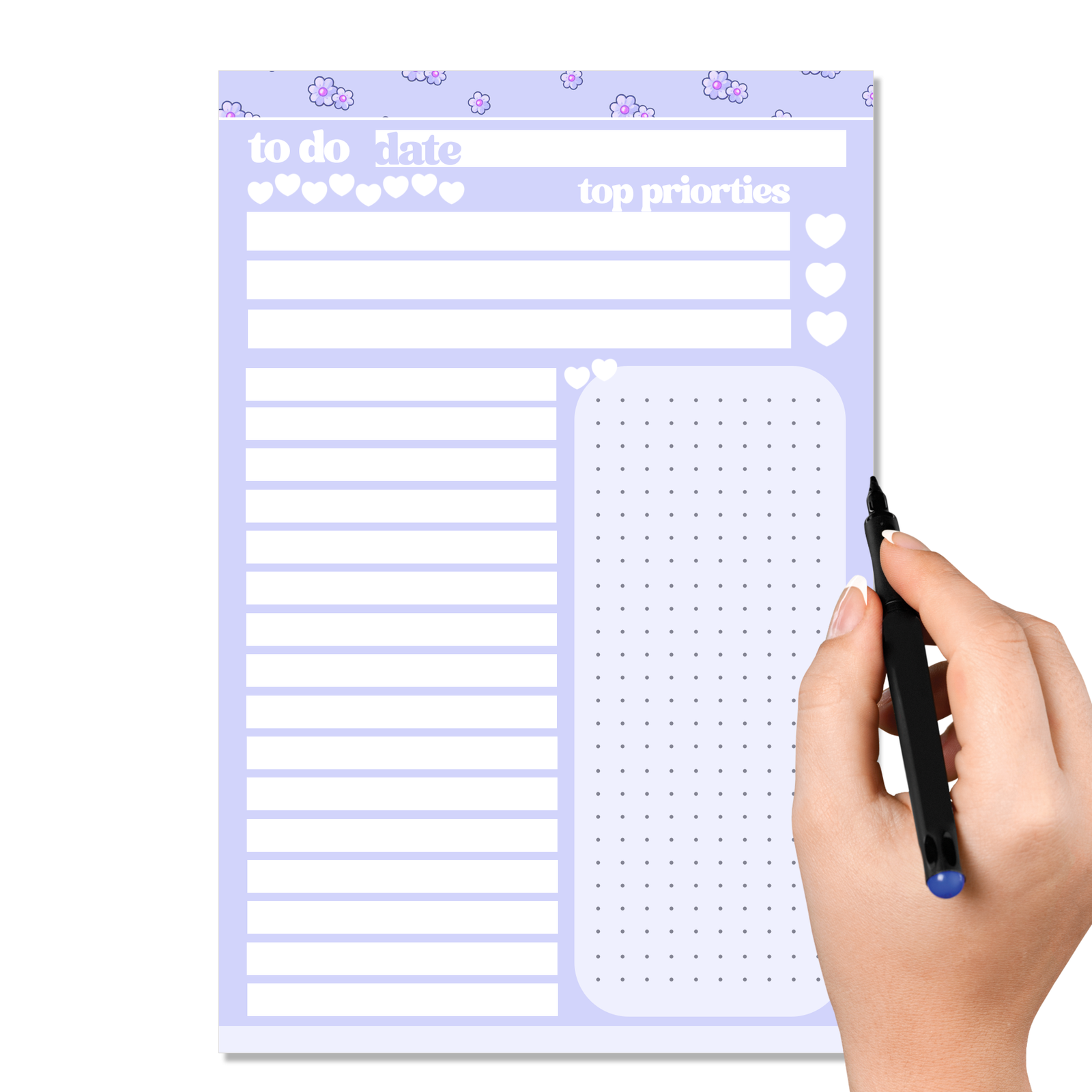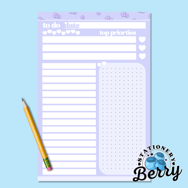 The Cute Daisies Purple To Do Pads are designed to make staying organized both easy and enjoyable. With 40 tear-away sheets bound at the top, this pad is perfect for desks, planners, clipboards, or kitchen counters. Each page begins with a clear date area so you can track your day, followed by three priority sections to help you focus on what matters most. These priority areas are ideal for top tasks, deadlines, or goals you want to complete first.