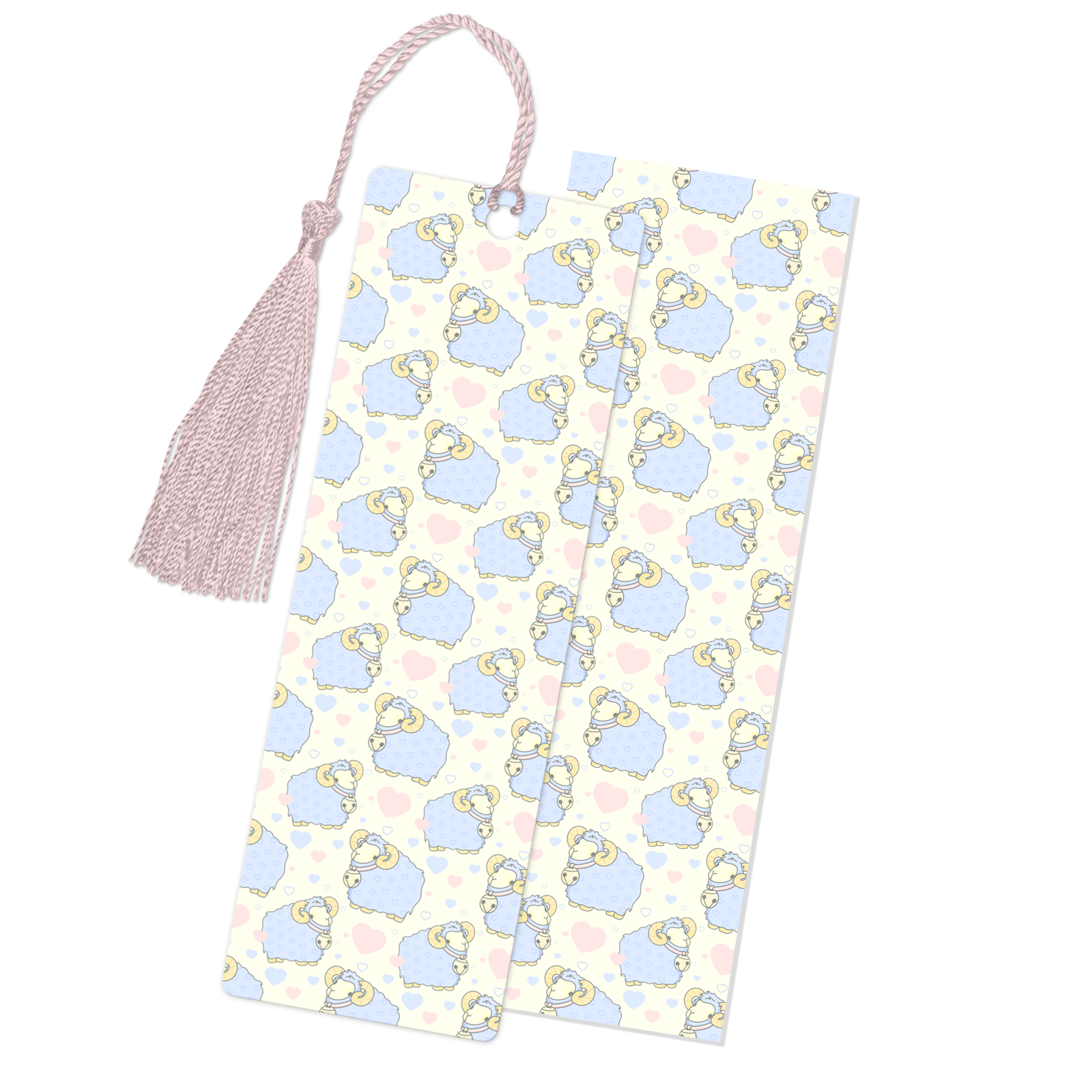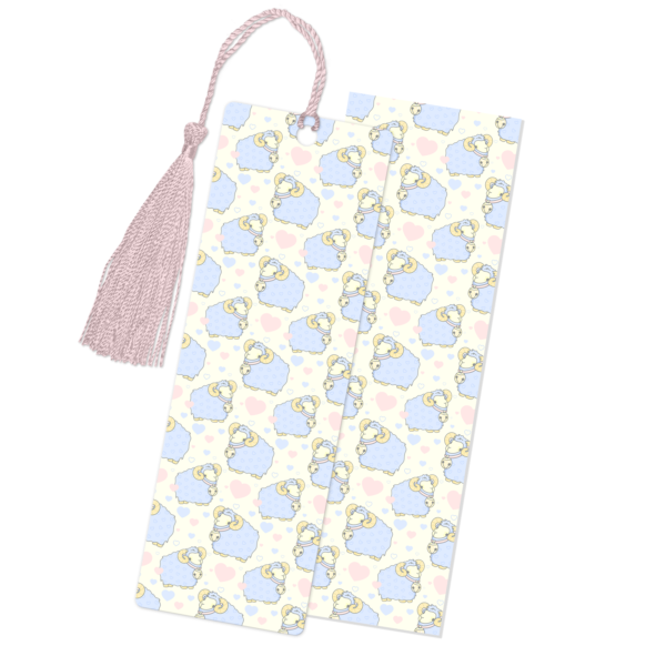 The Cute Rams Bookmark is a soft and cheerful reading companion, featuring a repeating pattern of little rams and pink hearts on a cream-colored background, finished with a sweet pink tassel.