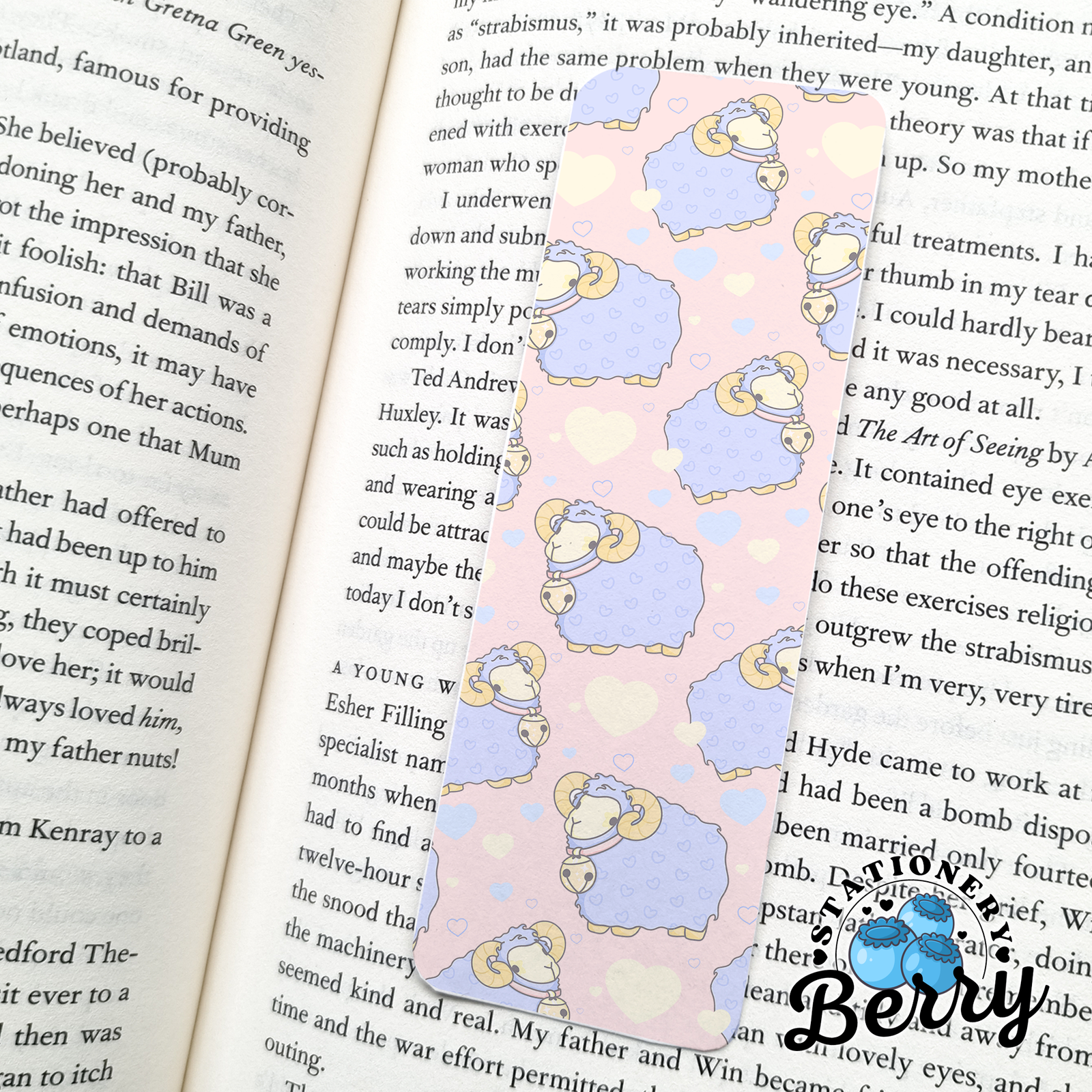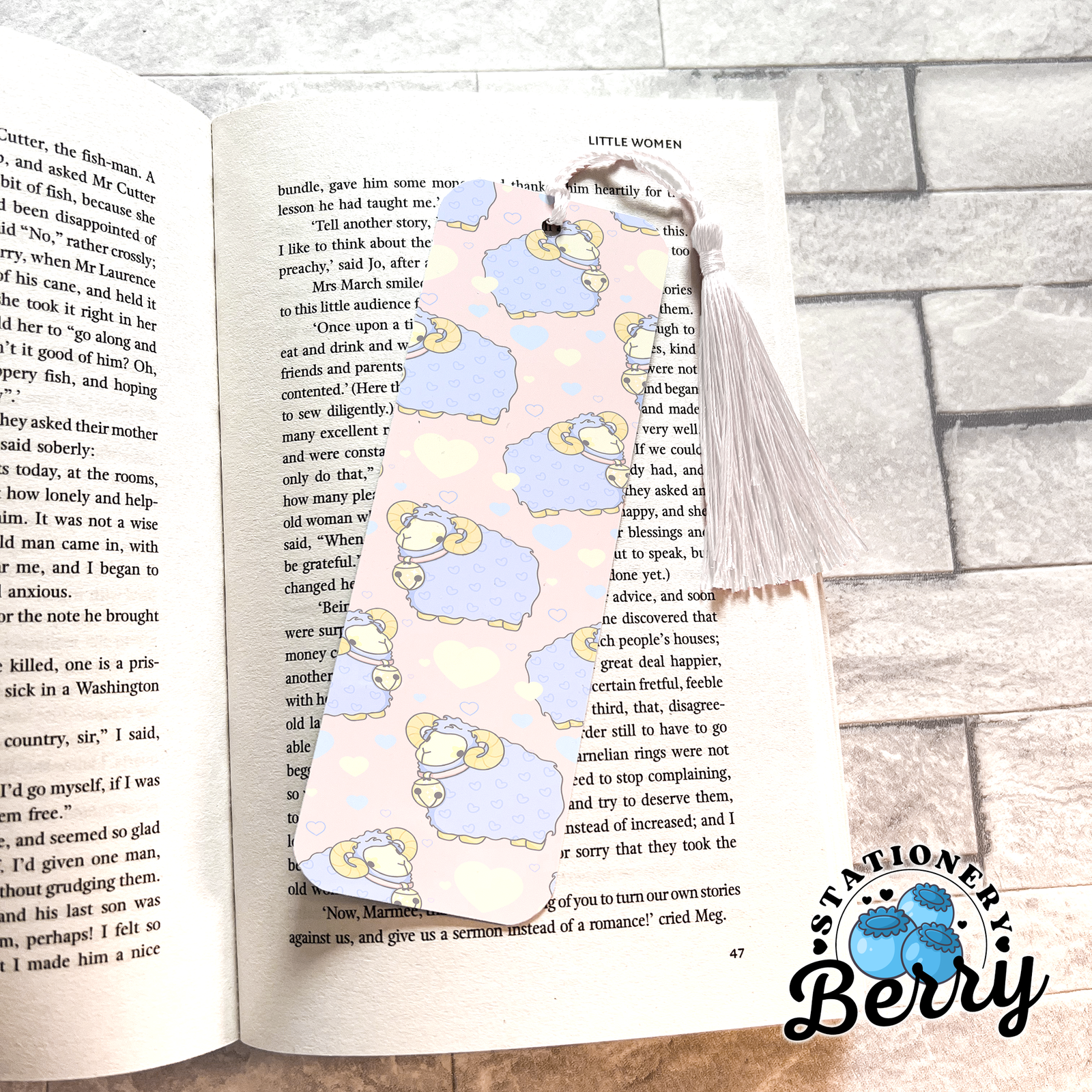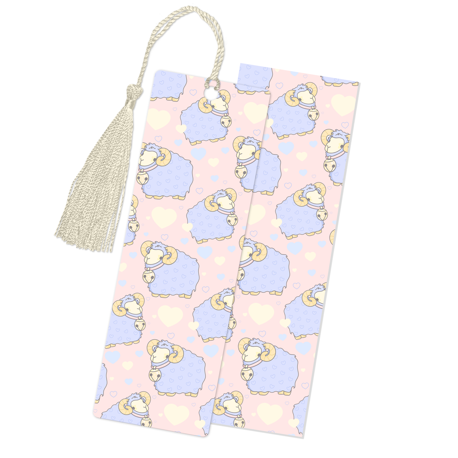 The Cute Rams Pink Bookmark is a sweet and cozy reading companion featuring tiny rams and pink hearts on a soft pink background, finished with a cream tassel for a gentle, charming touch.