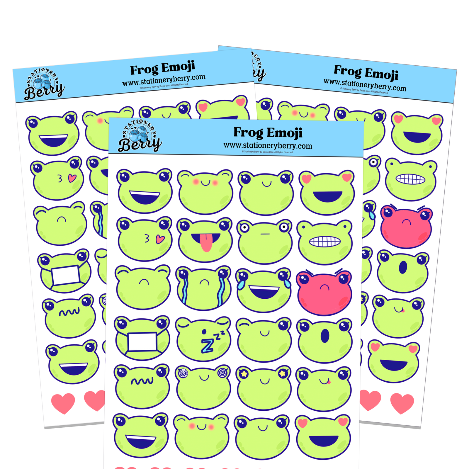 Every Frog Emoji Sticker Sheet features original hand-drawn artwork and is carefully assembled by me, Becca Bleu. Because each Sticker Sheet is handmade, no two are exactly alike. This makes it perfect for stationery lovers, sticker collectors, and anyone who wants to add a little humor and happiness to their planning routine.