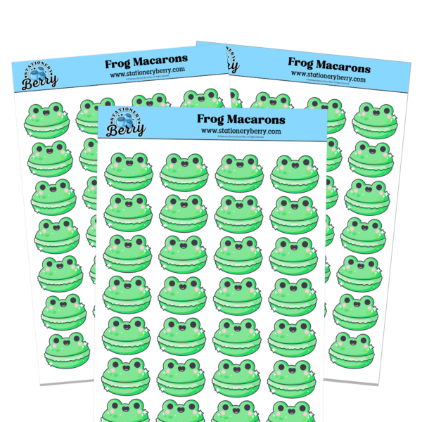 The Frog Macaron Sticker Sheet features green frog-shaped macaron cookies for planners and journals. Handmade and irresistibly cute.