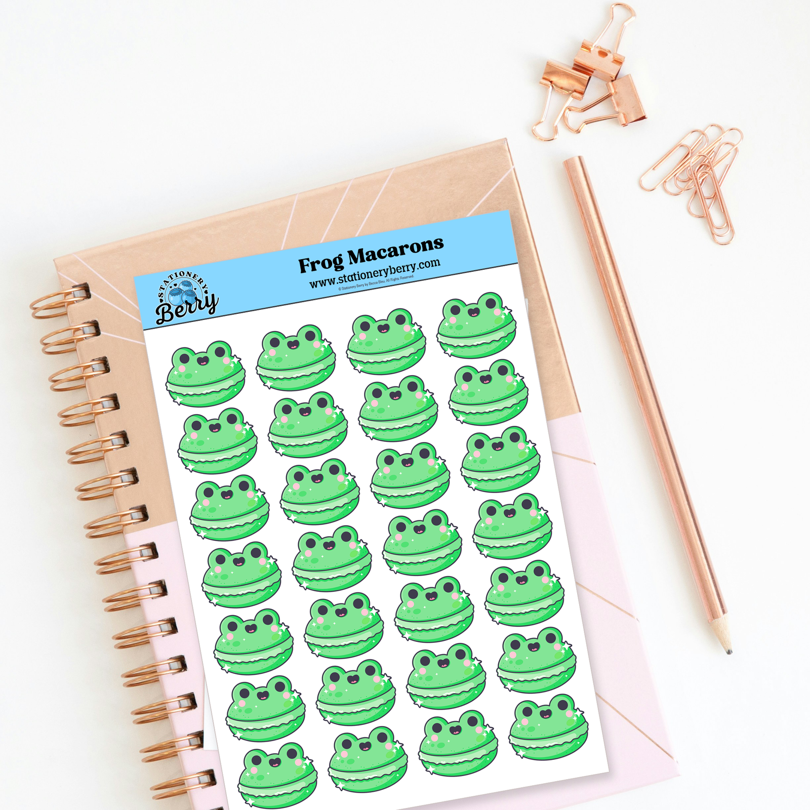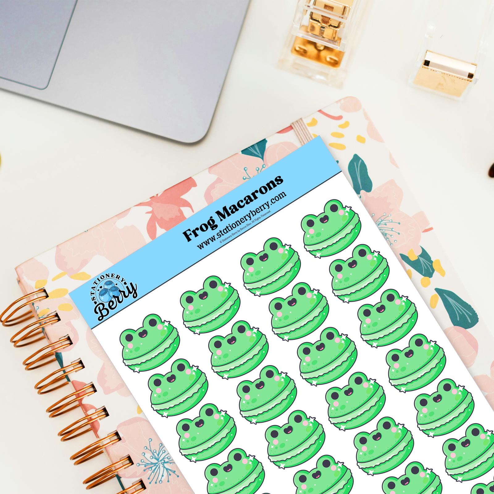 The Frog Macaron Sticker Sheet features green frog-shaped macaron cookies for planners and journals. Handmade and irresistibly cute.