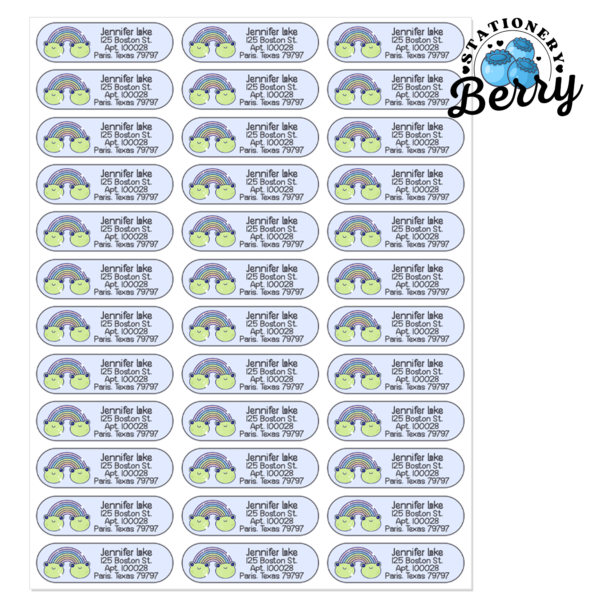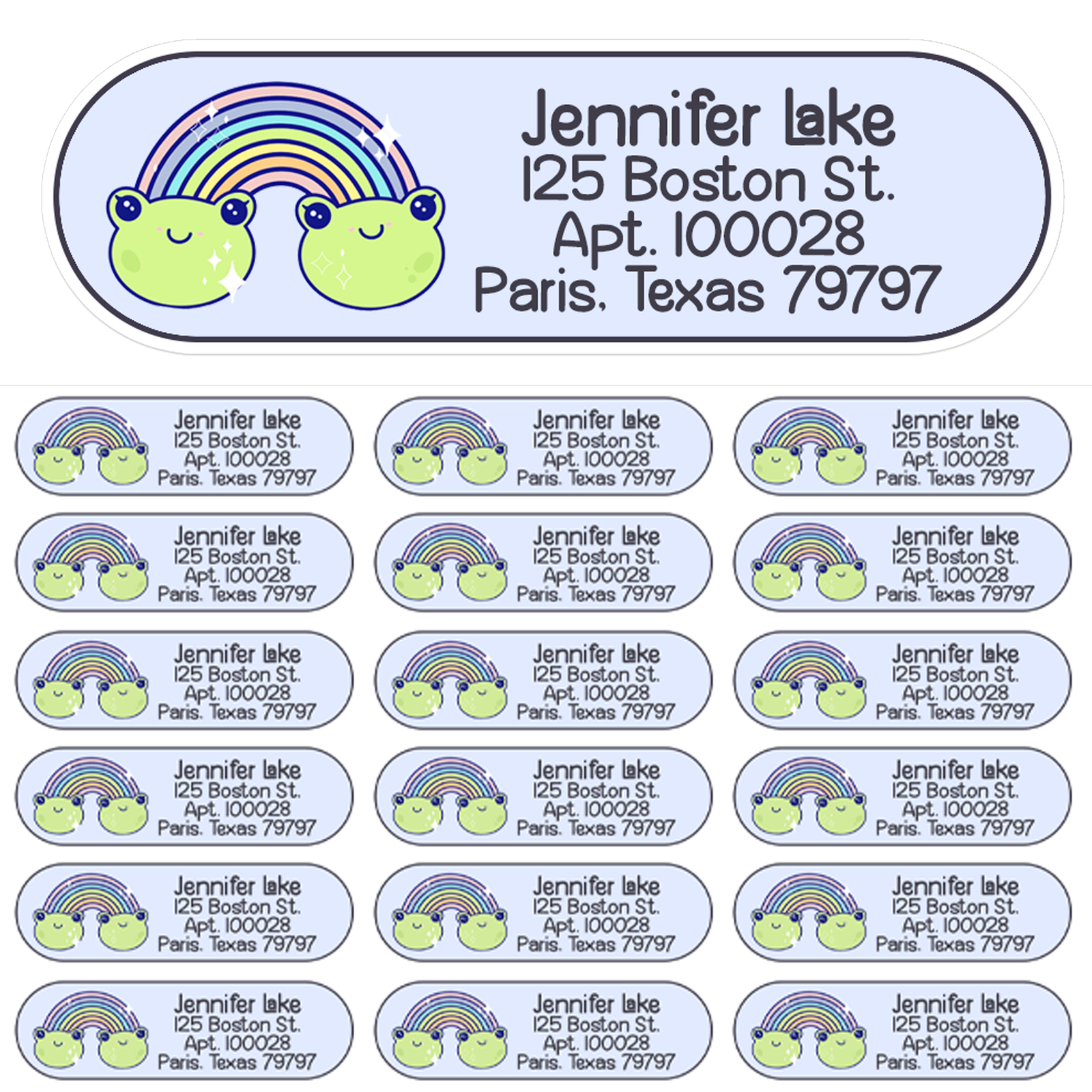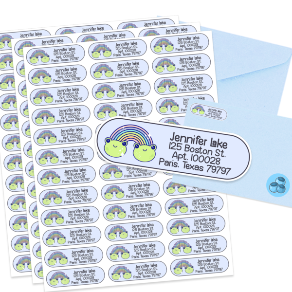 Playful and bright, Froggy Rainbow Address Labels bring a smile to every envelope. With a cheerful rainbow and cute frog faces on each end set against a light blue background, these labels turn everyday mail into something extra special.
