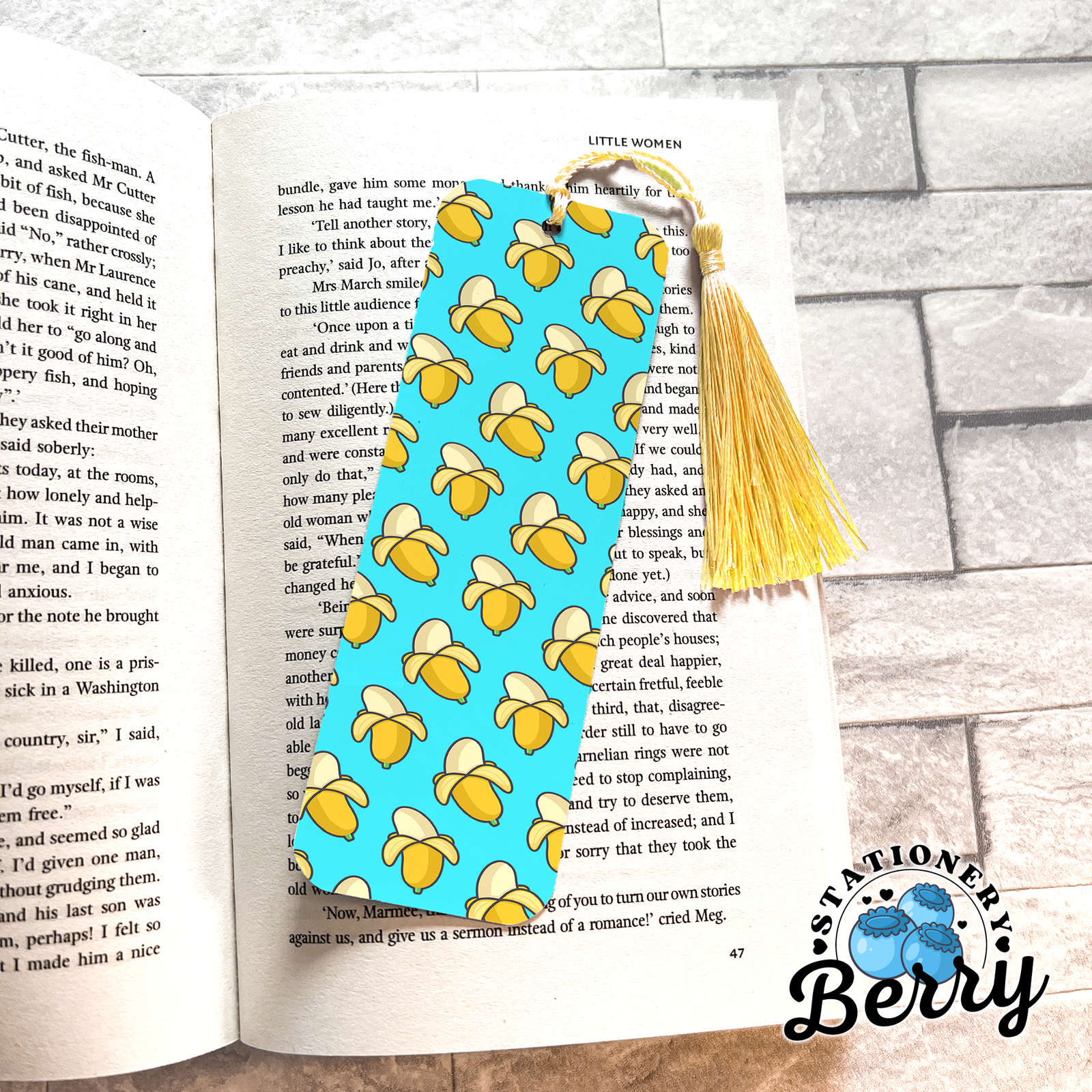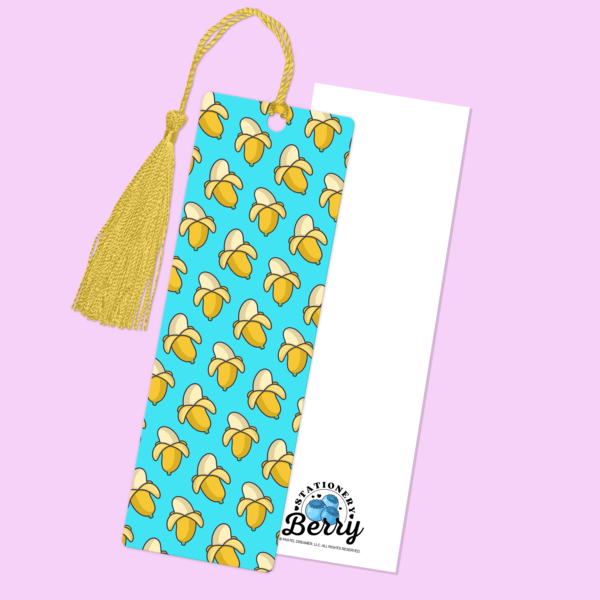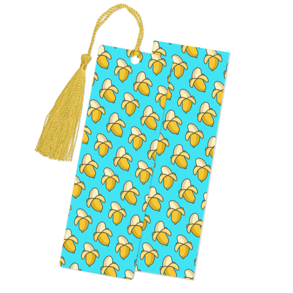 The Going Bananas Blue Bookmark is a bright and playful page marker featuring cute yellow bananas on a cheerful blue background with a sunny yellow tassel. It’s a fun design made for readers who love bold color and whimsical art.