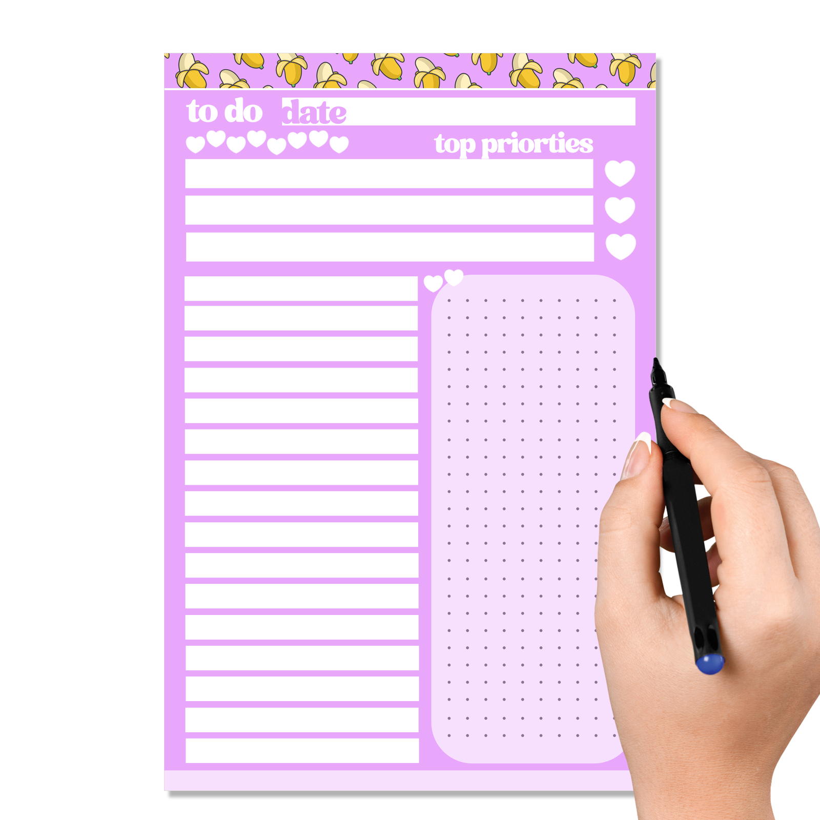 As part of my handmade collection of To Do Pads, the Going Bananas Purple To Do Pad combines original artwork with a functional layout inspired by Bananas and playful everyday themes. These To Do Pads are perfect for students, teachers, office workers, and stationery lovers who enjoy turning simple To Do lists into something cute and uplifting. Whether you’re planning your workday or organizing your weekend, this pad makes productivity feel bright and happy.
