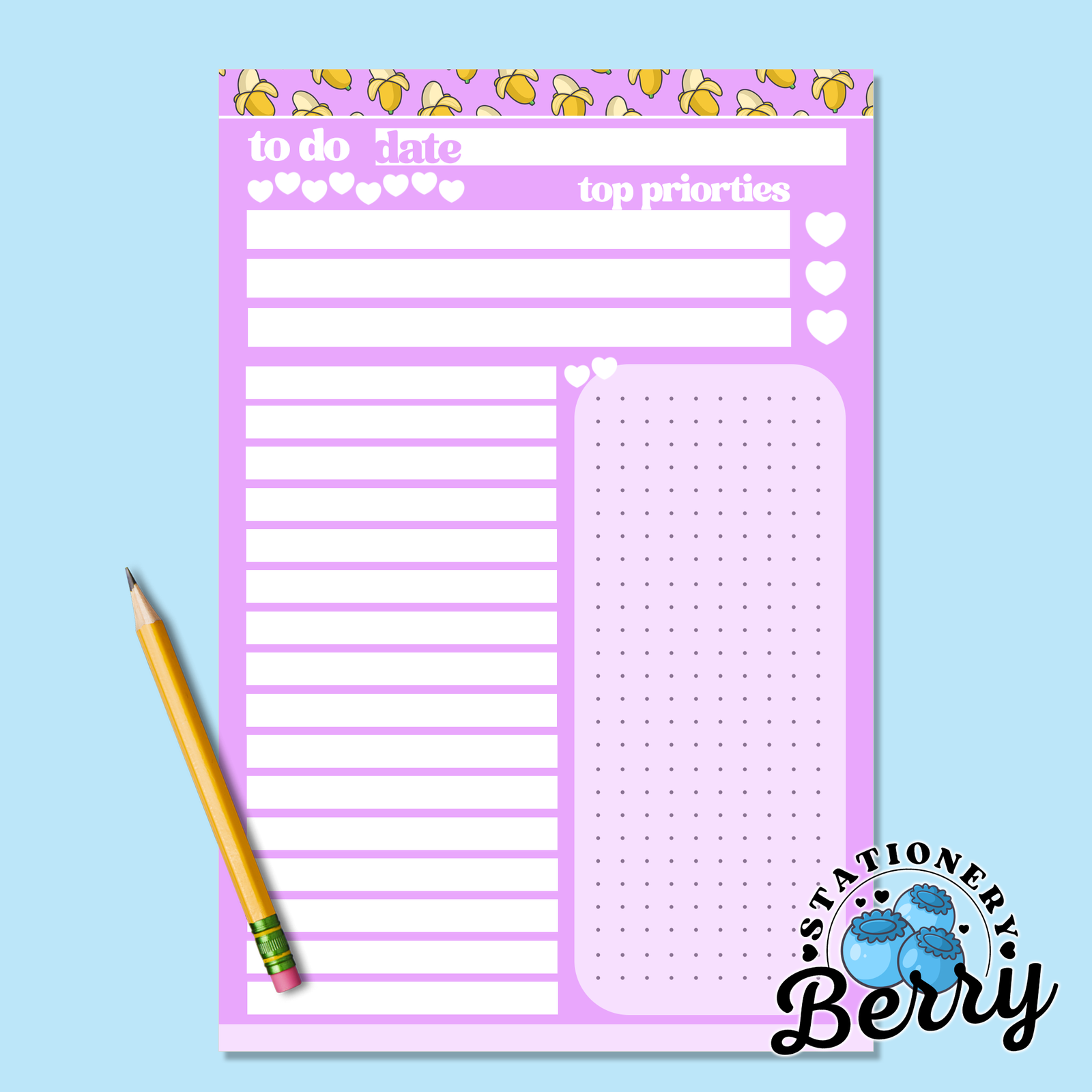 Below the priority sections, the dotted area offers flexible space for custom information. Use this section for notes, reminders, meal plans, or even small doodles to personalize your list. Beneath that, 16 lined rows provide plenty of room for everything else you need to do, from errands and chores to work projects and creative ideas. The purple background keeps the page vibrant and eye-catching, while the banana pattern at the top adds a fun decorative touch without taking away from your writing space.