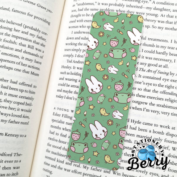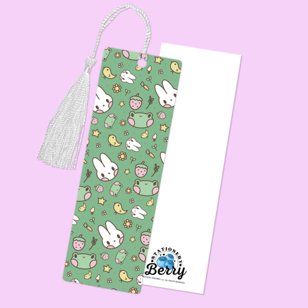 The Kawaii Friends Bookmark features an adorable pattern of cute frogs and bunnies on a soft green background, finished with a clean white tassel for a sweet and playful look.