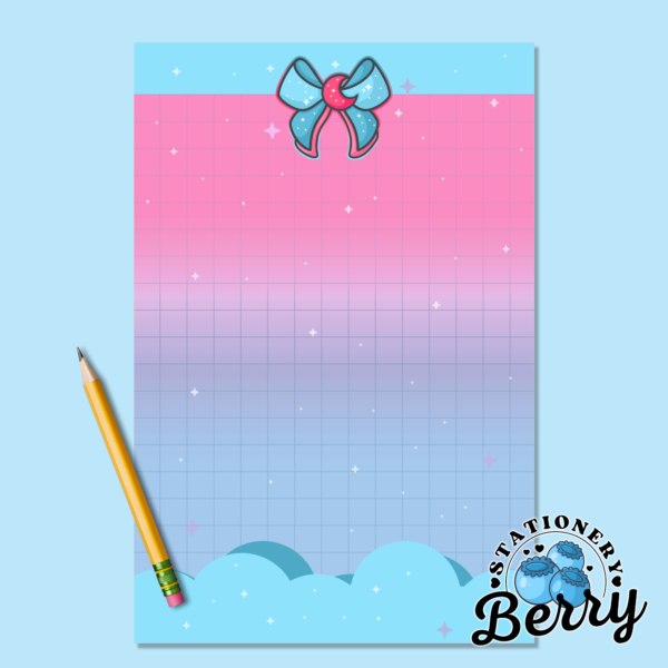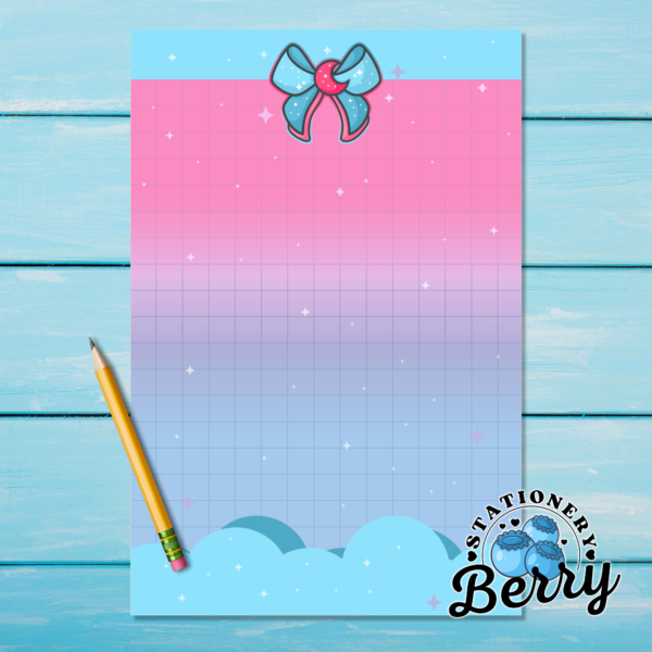 The Magical Moon Blue Memo Pad is a 4×6 tear-away to do pad with bows, clouds, and a grid writing area on a pink and blue background. Cute, practical, and perfect for daily lists.