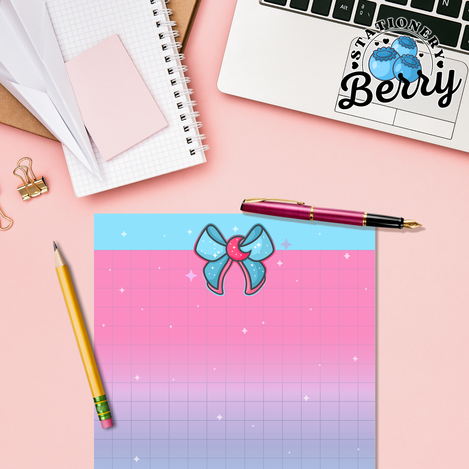 The Magical Moon Blue Memo Pad is a 4×6 tear-away to do pad with bows, clouds, and a grid writing area on a pink and blue background. Cute, practical, and perfect for daily lists.