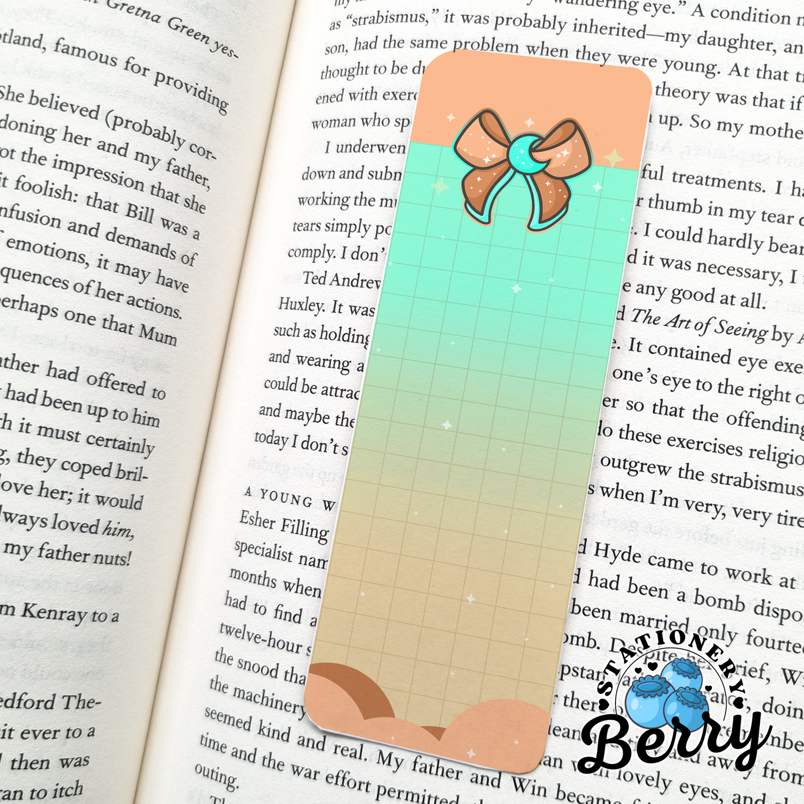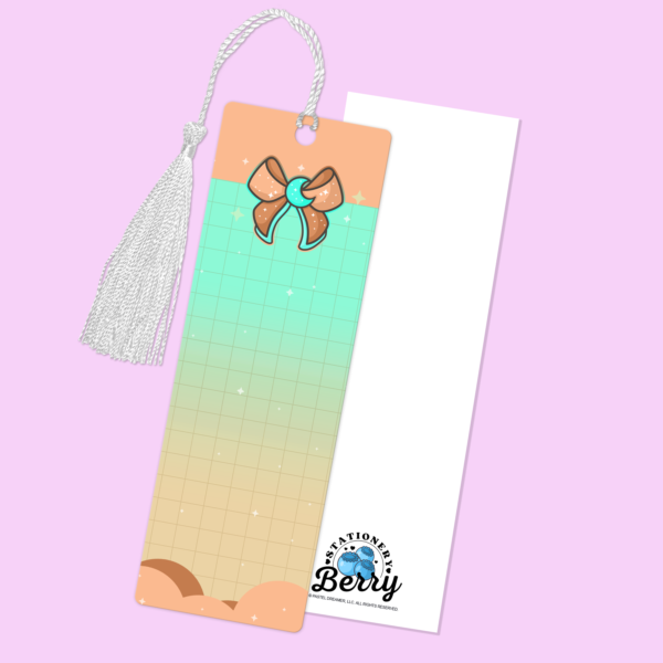 The Magical Moon Bow Peach Bookmark features a peach bow with a mint moon on a dreamy pastel sky. A sweet celestial accent for books and planners.