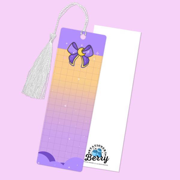 The Magical Moon Bow Purple Bookmark is a rich and dreamy page marker featuring a purple bow with a gold moon at its center, set against a purple and gold sky with soft purple clouds and a white tassel.