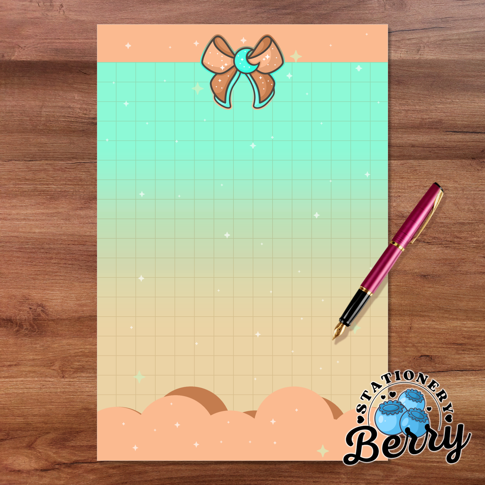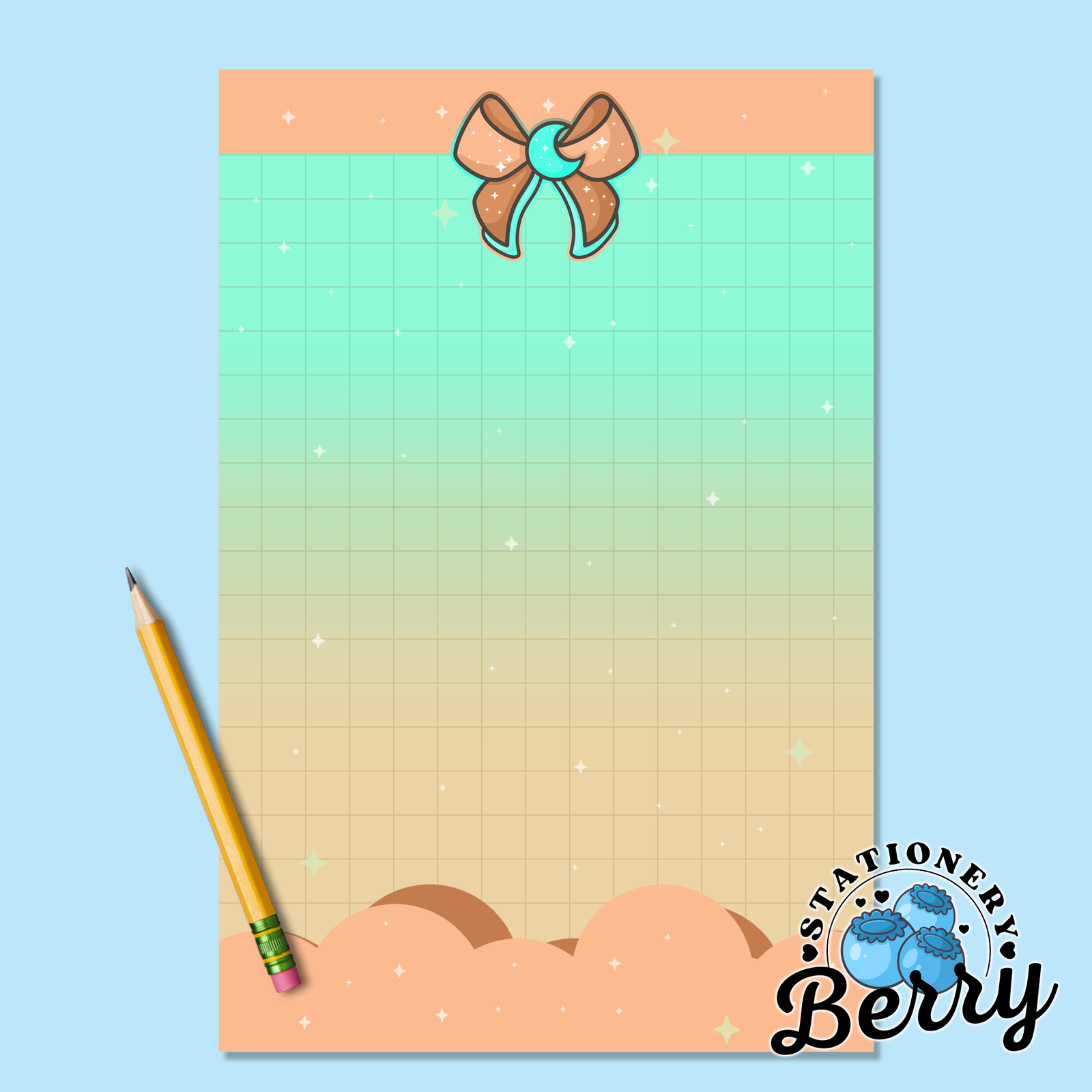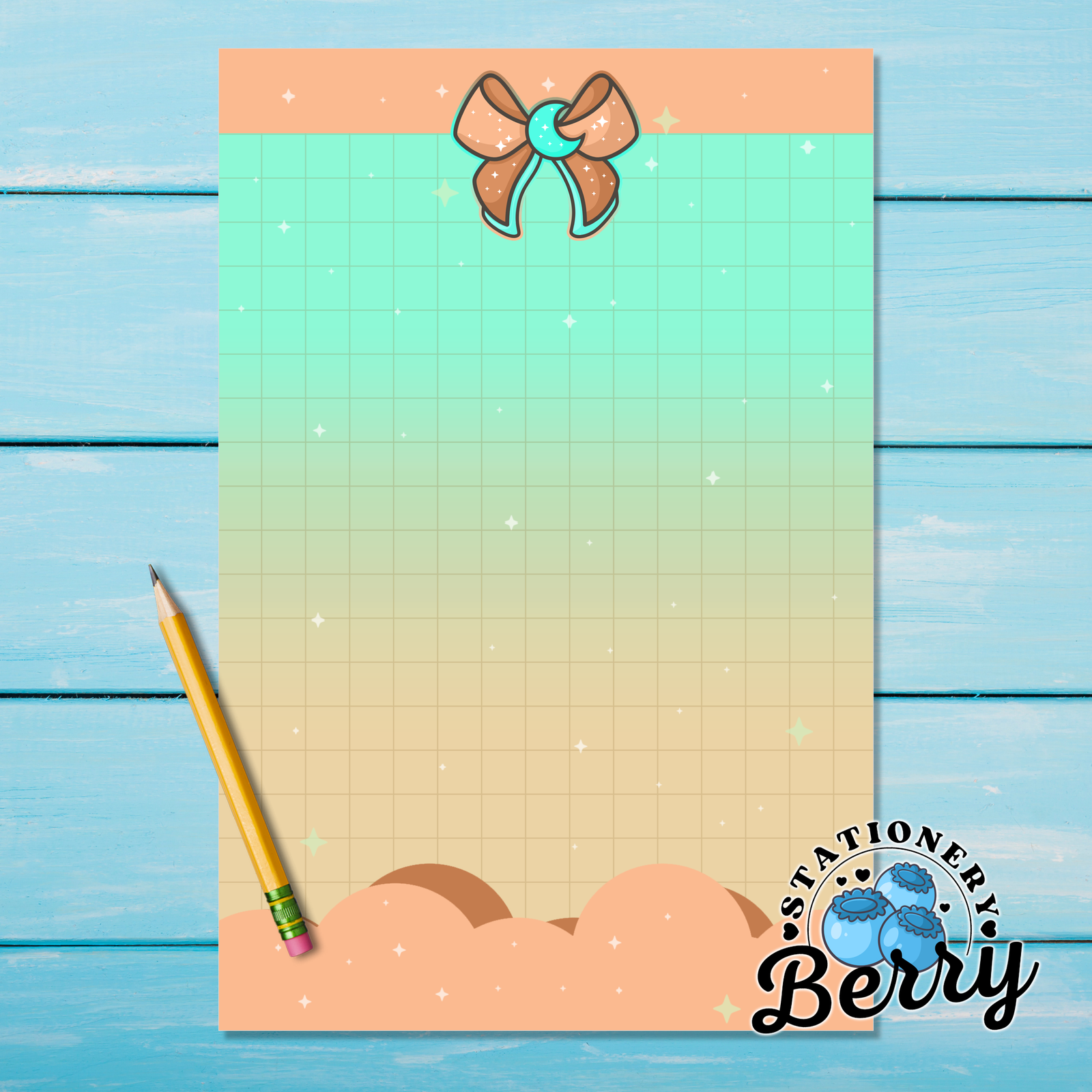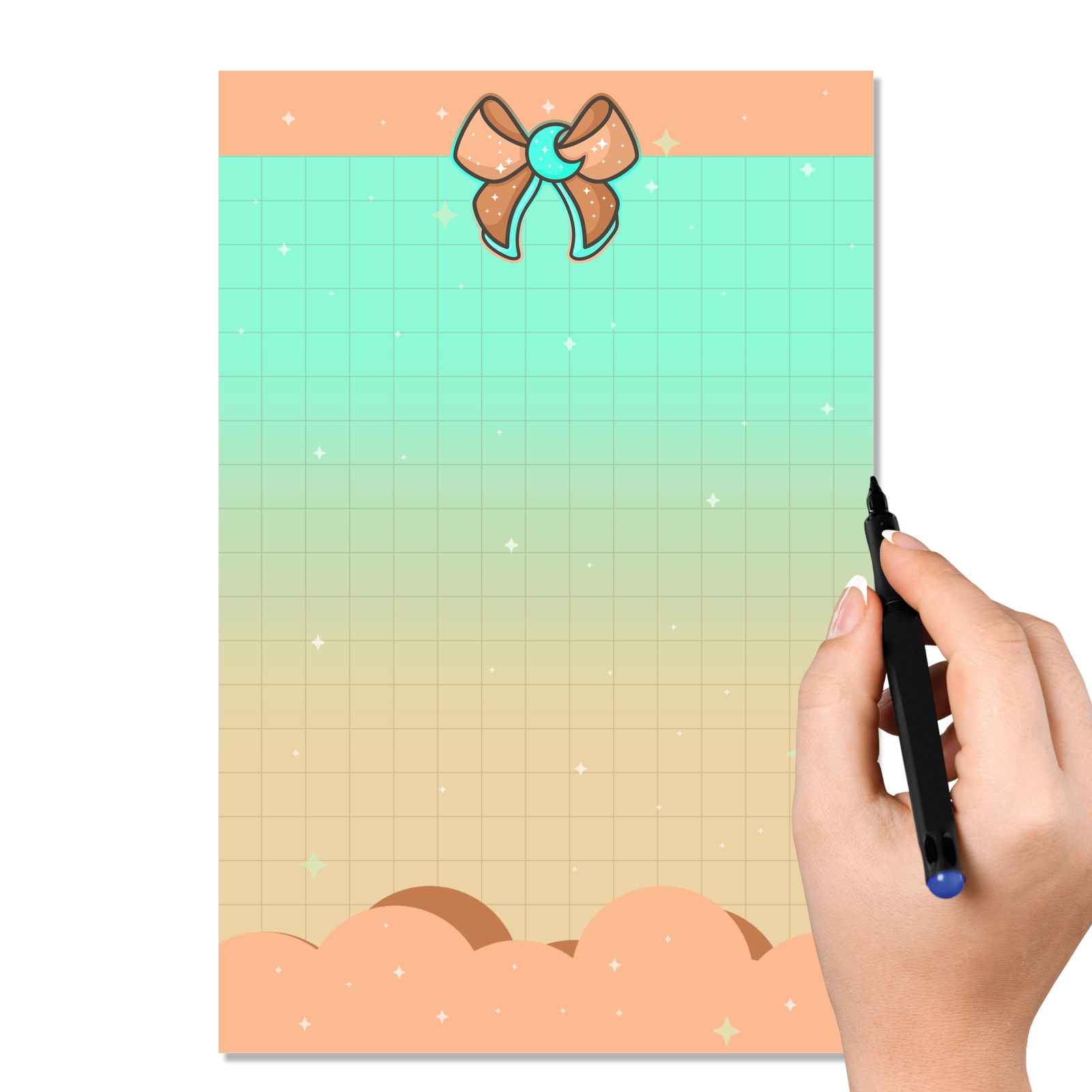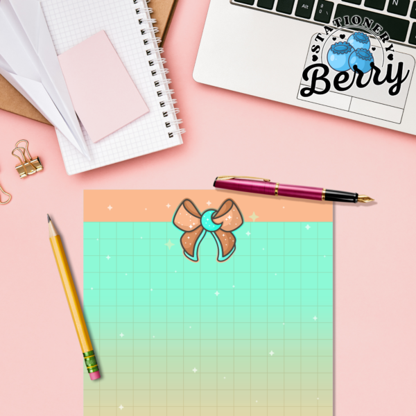 The Magical Moon Peach Memo Pad is perfect for stationery lovers who enjoy dreamy designs paired with everyday function. Each sheet is lovingly handdrawn by me, Becca Bleu, making every pad completely unique and something you won’t find anywhere else. The peach bow and mint moon create a gentle, celestial focal point, while the cloud details soften the design and give it a light, floating feel. The grid pattern in the middle provides an ample area for writing, helping your tasks stay tidy, aligned, and easy to read throughout the day.