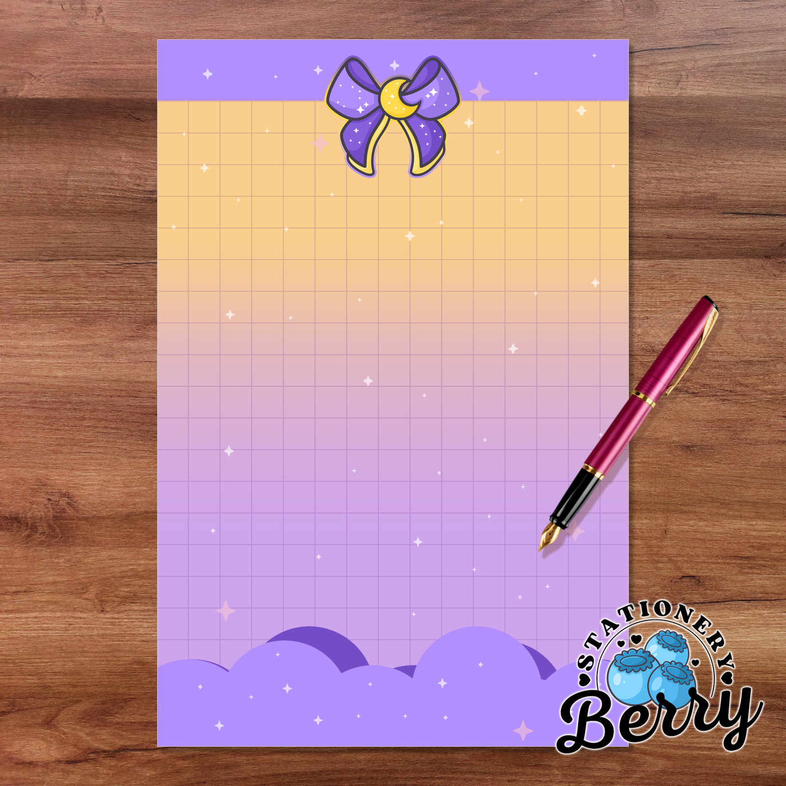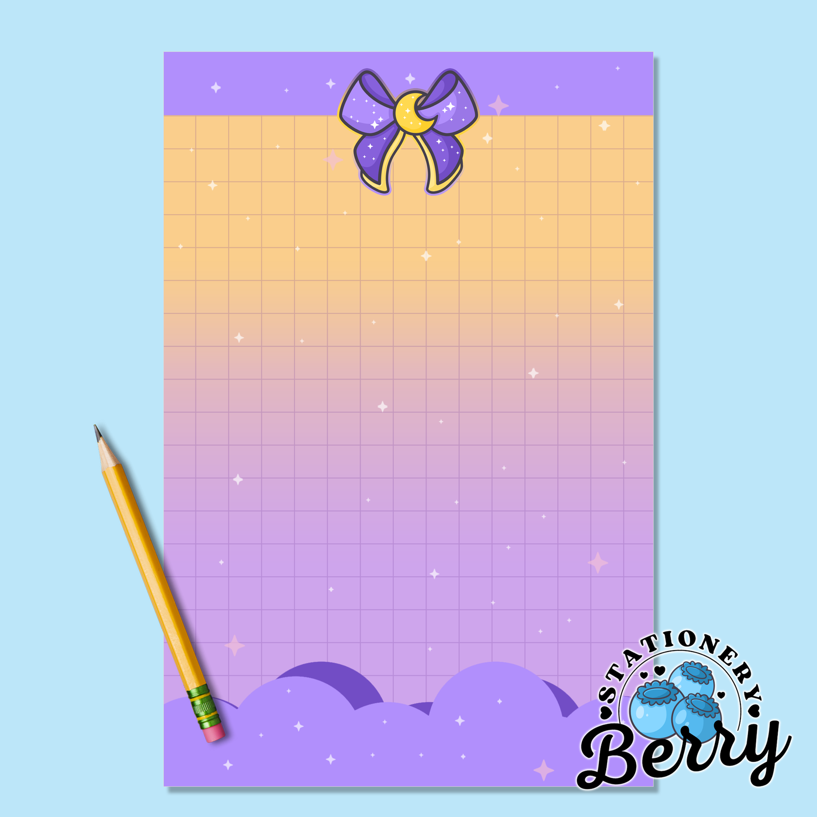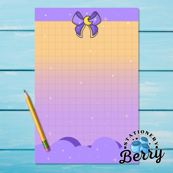 The Magical Moon Purple Memo Pad is created for stationery lovers who enjoy playful design with practical purpose. Every sheet is lovingly handdrawn by me, Becca Bleu, making this memo pad truly one of a kind and not something you will find anywhere else. The purple bow and cheerful yellow moon create a bold celestial focal point, while the cloud details soften the look and keep the design light and dreamy. The grid pattern in the middle provides an ample area for writing, helping your lists stay neat, aligned, and easy to read throughout the day.