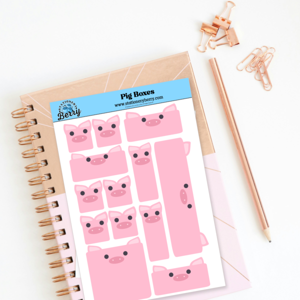 The Piggy Boxes Sticker Sheet features cute pig planner boxes for organizing your pages. Handmade and full of playful charm.