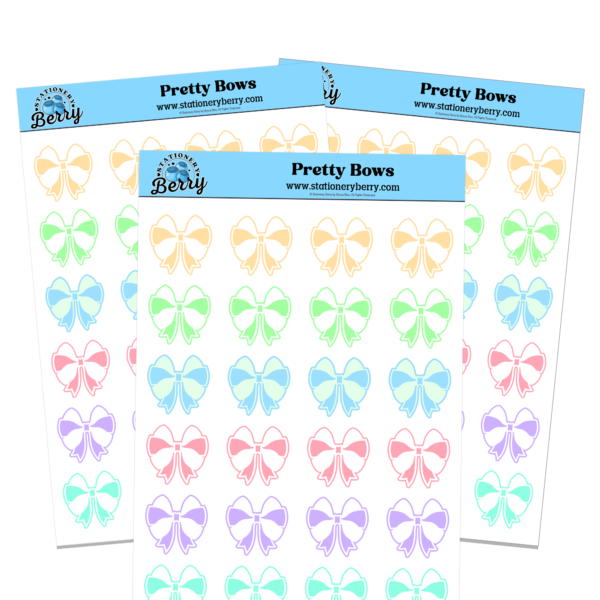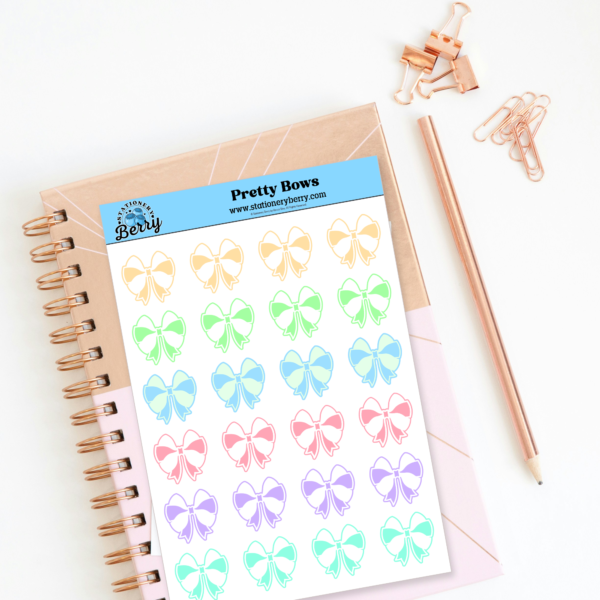 The Pretty Bows Sticker Sheet features pastel-colored bows for planners and journals. Handmade and perfect for soft, decorative layouts.