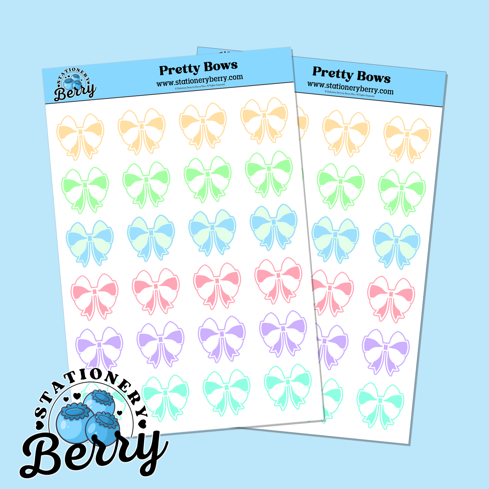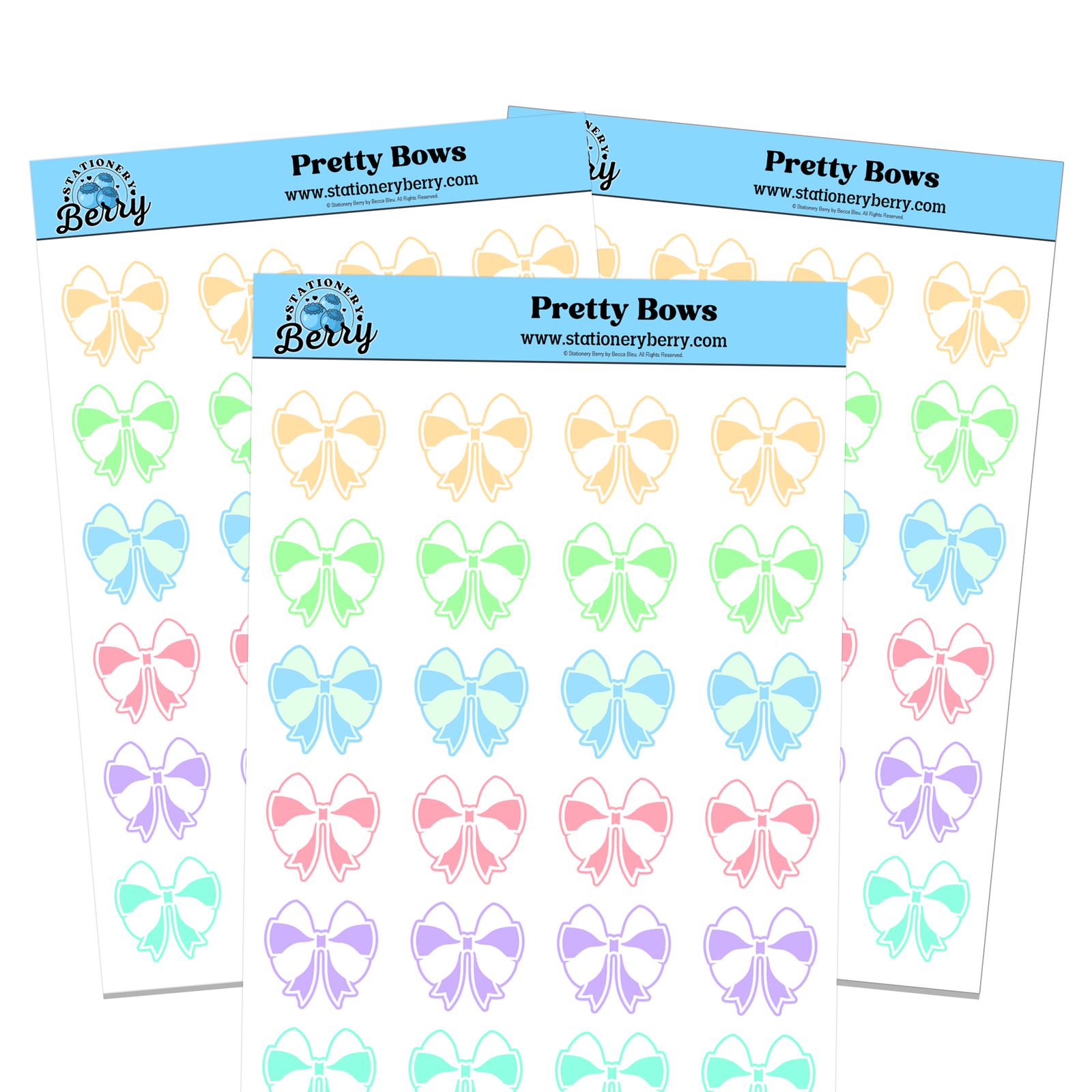 The Pretty Bows Sticker Sheet is a soft and stylish way to decorate your planner and journal pages with charming pastel details. Featuring multiple pastel-colored bows, this Sticker Sheet adds a sweet and elegant touch to everyday planning. Each design is hand-drawn and every sheet is handmade by me, Becca Bleu, making every piece truly unique and full of personality.