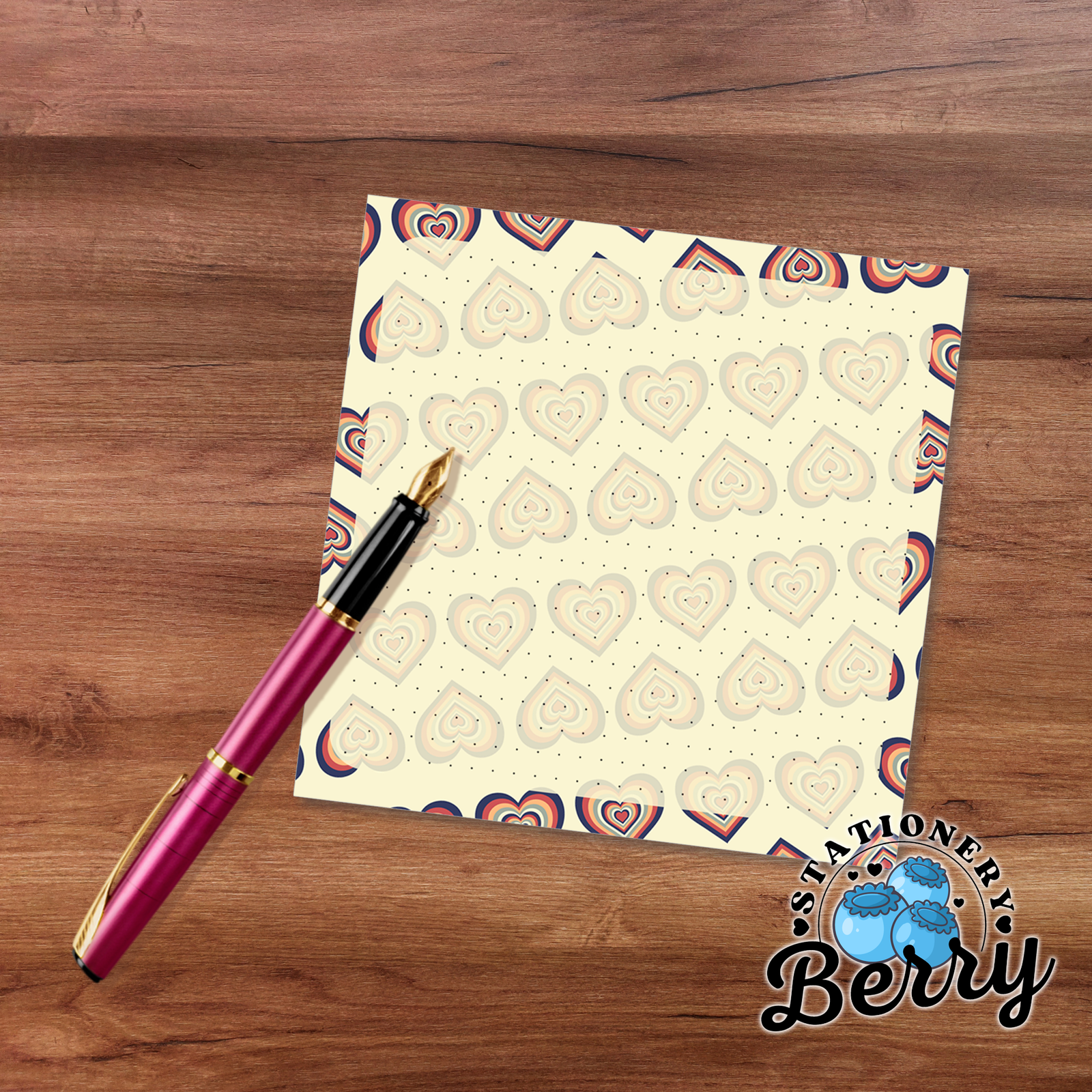 Fall in love with everyday notes using the Retro Hearts Cream Memo Pad — a handmade 4×4 tear-away Memo Pad that blends nostalgic style with modern practicality. Featuring a pattern of retro-colored hearts on a soft cream background, this Memo Pad adds warmth and charm to your daily writing.