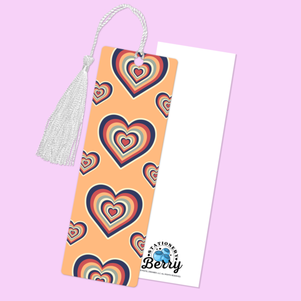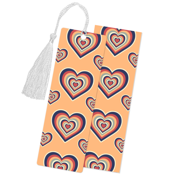 The Retro Hearts Orange Bookmark is a bright and nostalgic page marker featuring a pattern of retro-colored hearts on a warm orange background, finished with a classic white tassel.