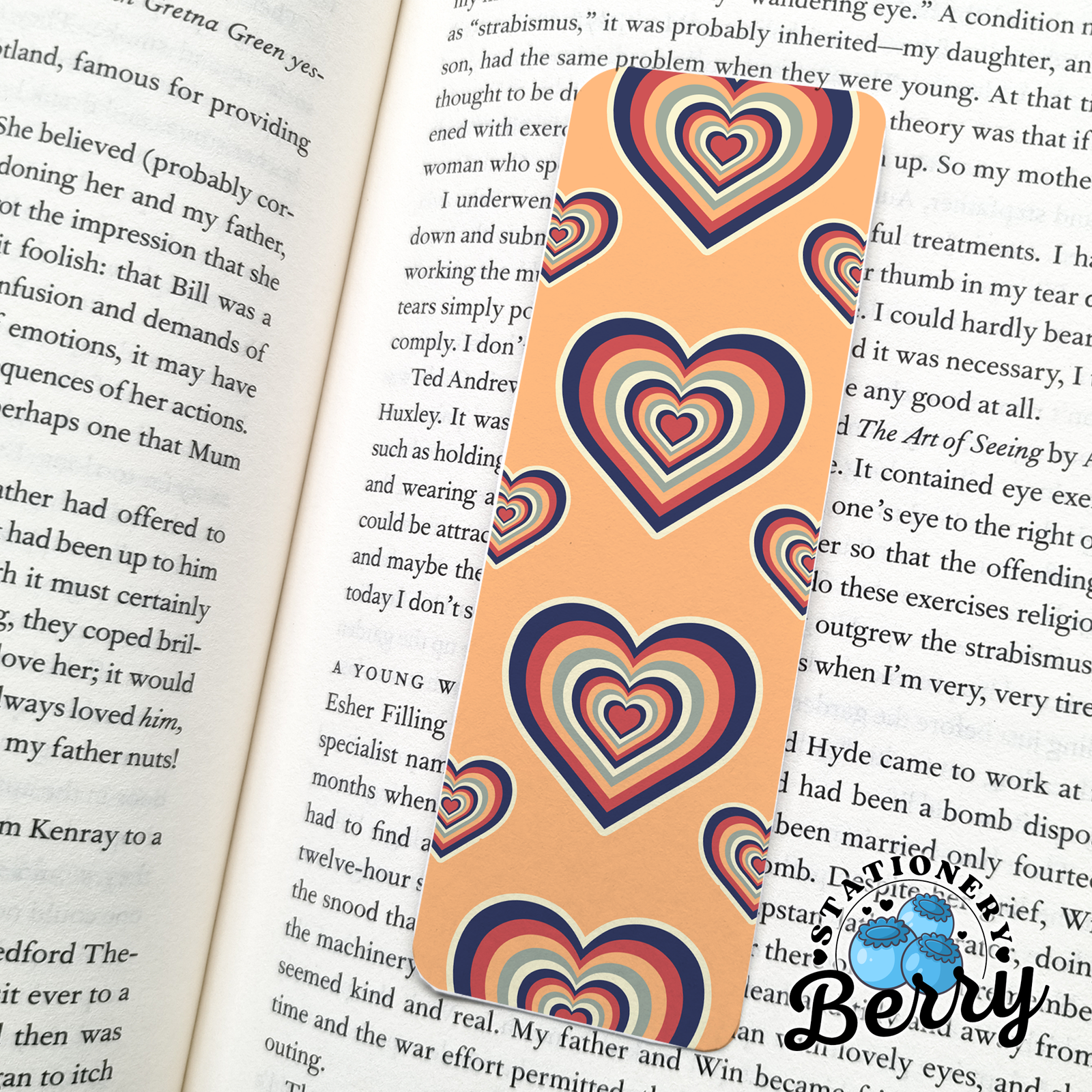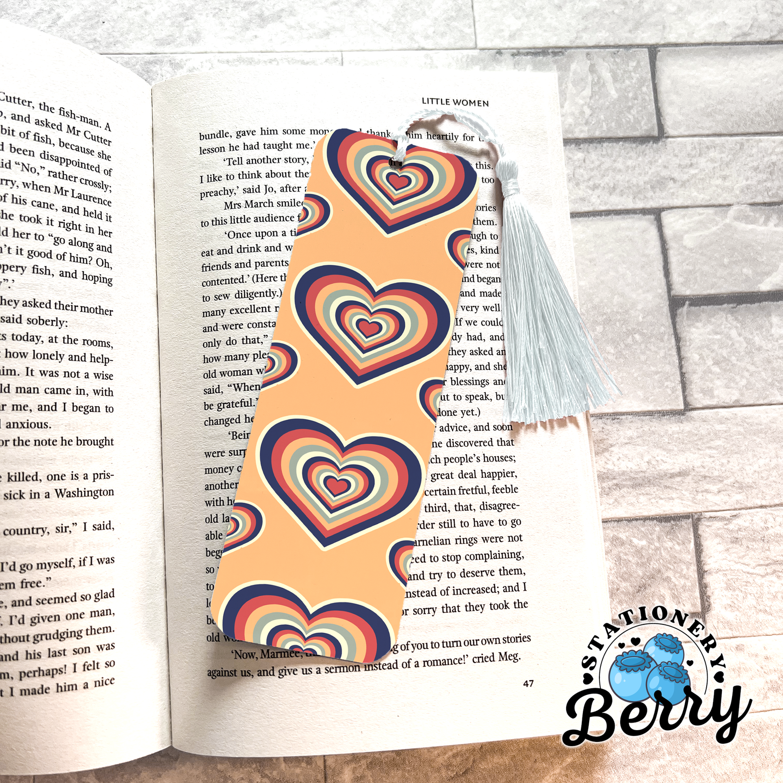 The Retro Hearts Orange Bookmark is a bright and nostalgic page marker featuring a pattern of retro-colored hearts on a warm orange background, finished with a classic white tassel.