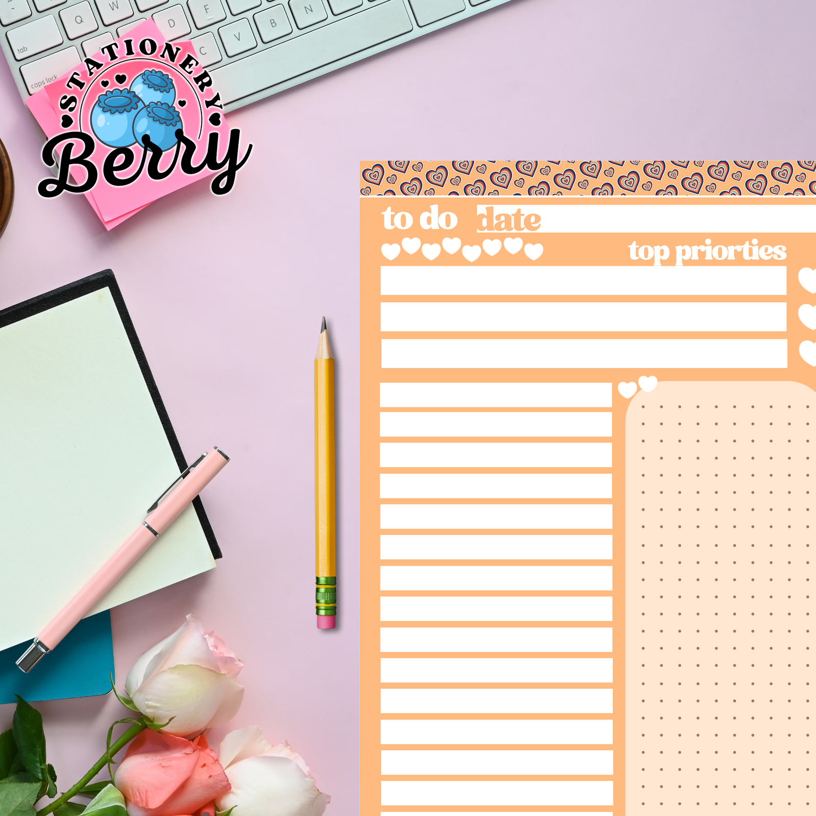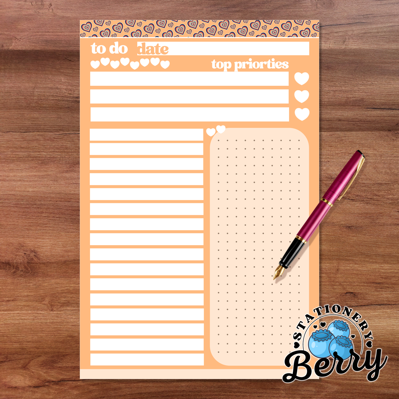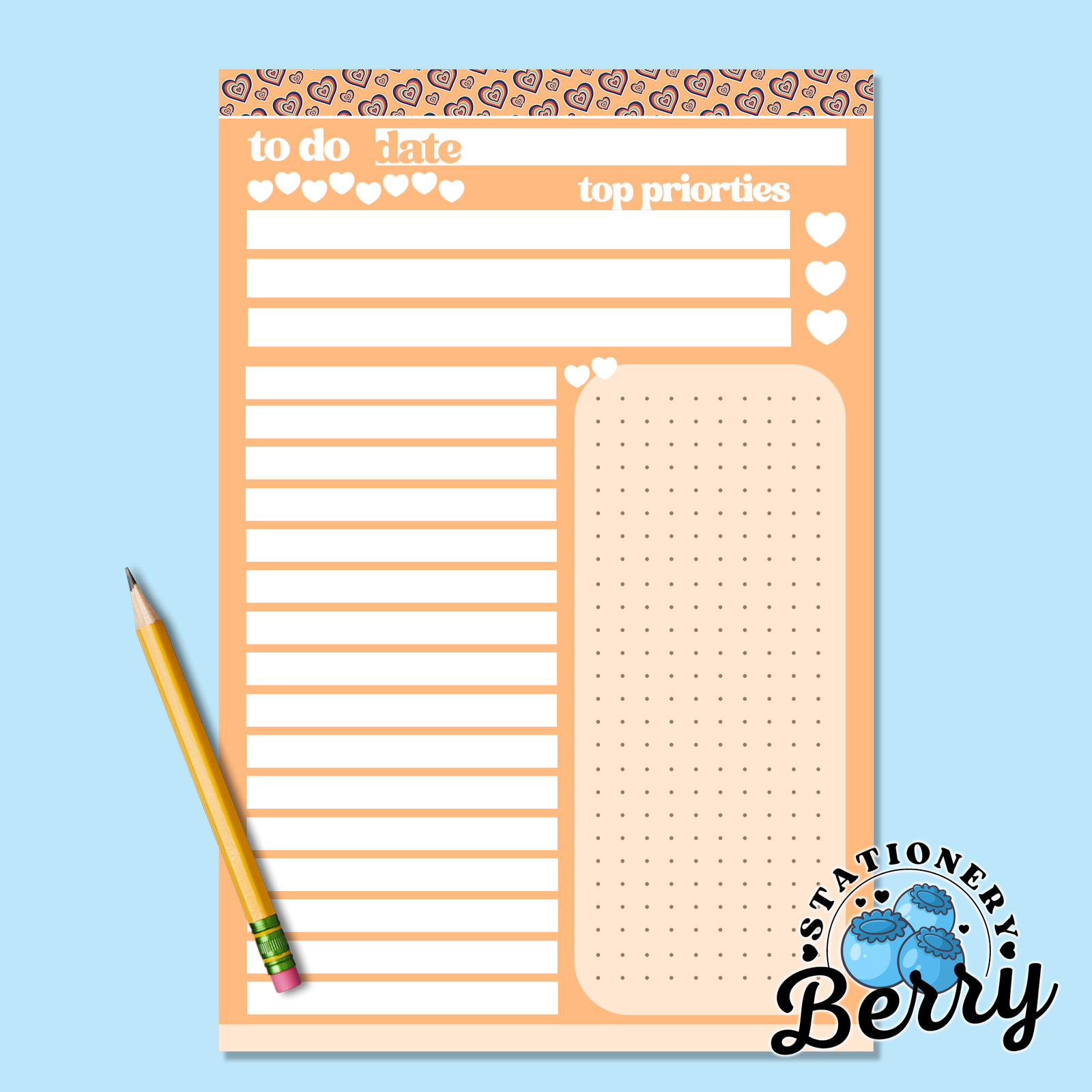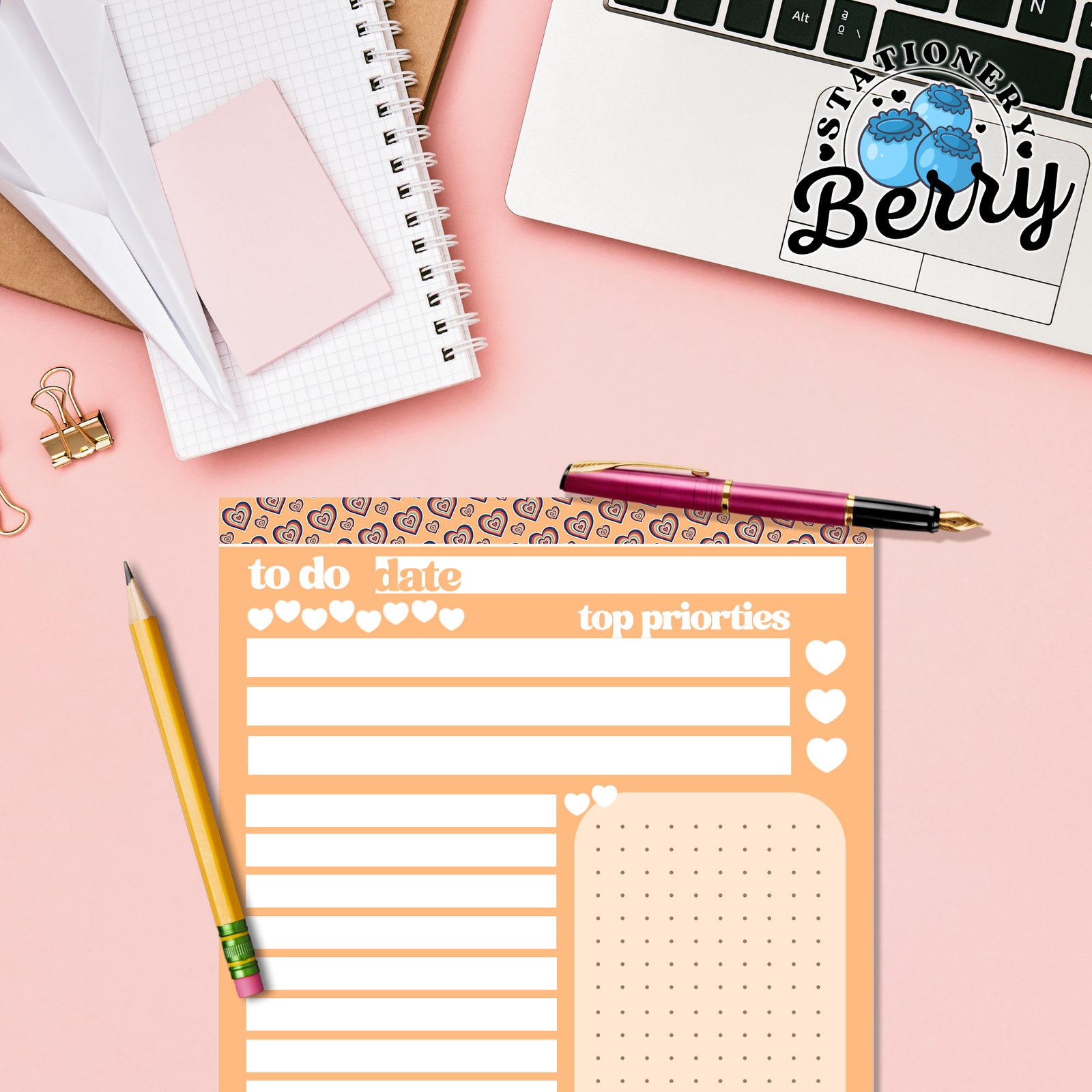 All of my To Do Pads are completely hand-drawn and handmade by me, Becca Bleu, making each Retro Hearts Orange To Do Pad a unique design you won’t find anywhere else. If you love bold color, nostalgic hearts, and stylish stationery, this pad is a cheerful way to stay organized. With its retro look and practical layout, it brings together fun design and everyday function in one bright, eye-catching page. Fans of colorful patterns, Rainbows-inspired palettes, and charming To Do Pads will adore this lively addition to their planning routine.
