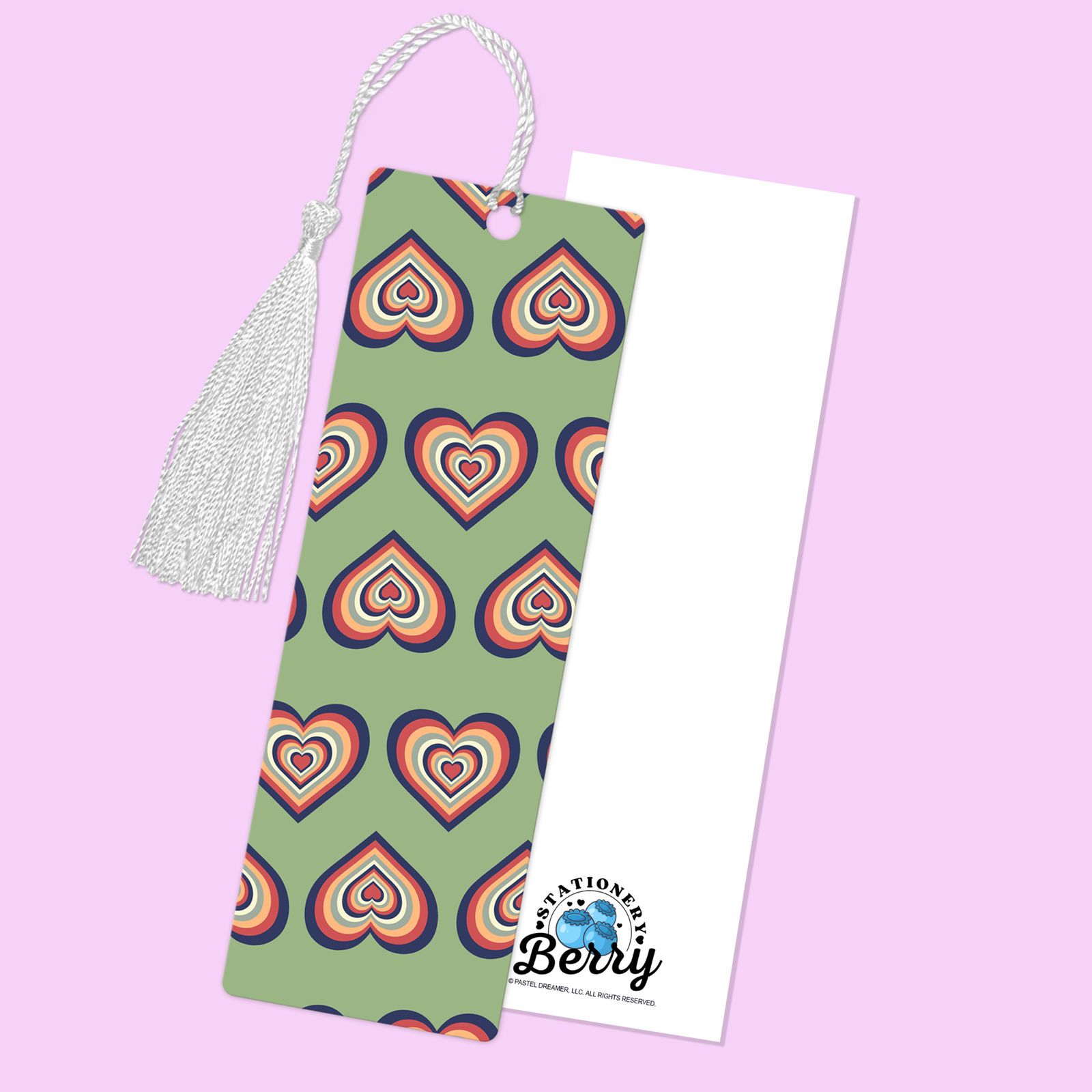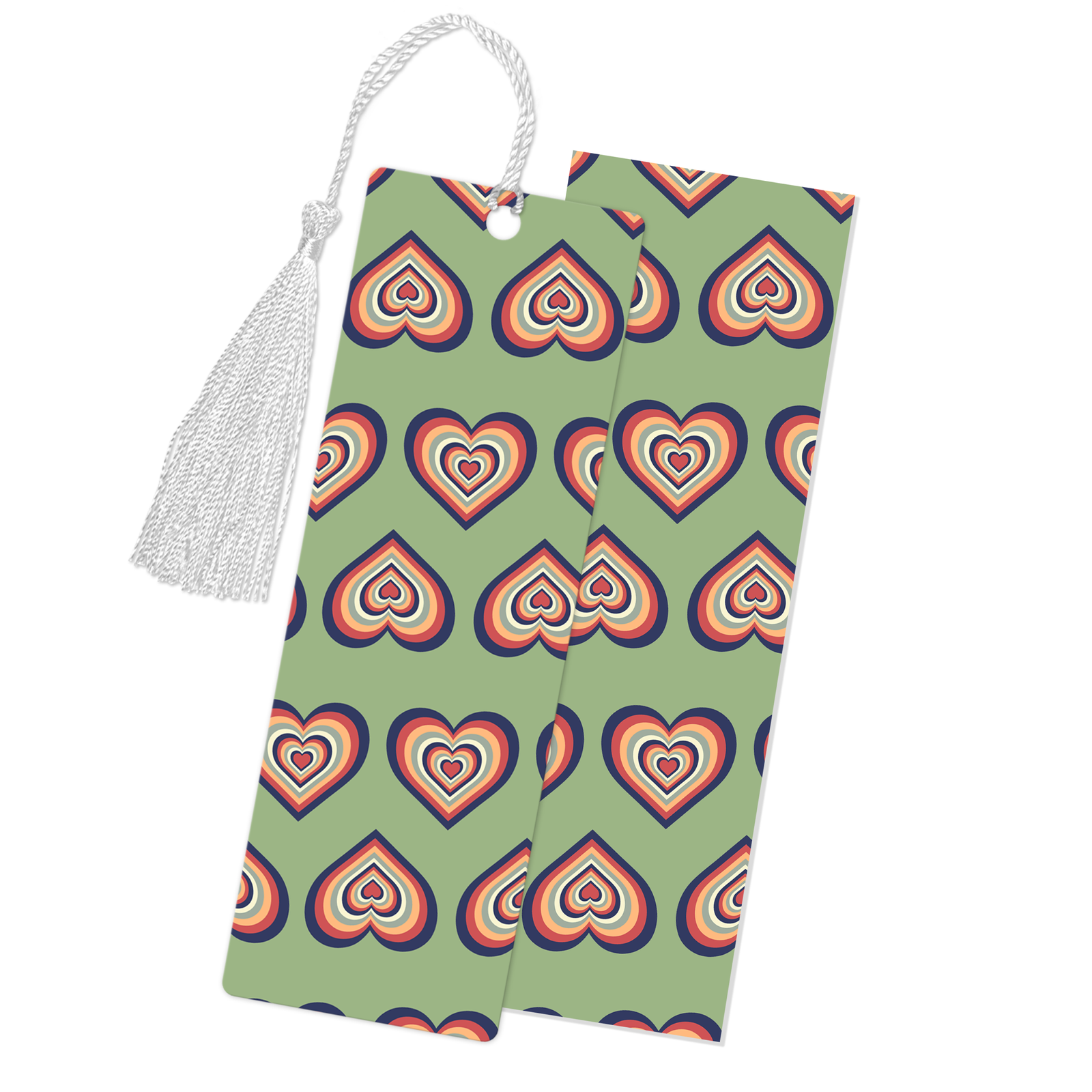 The Retro Hearts Sage Bookmark brings vintage charm and soft color together with a pattern of retro-colored hearts on a calming sage green background, finished with a crisp white tassel.