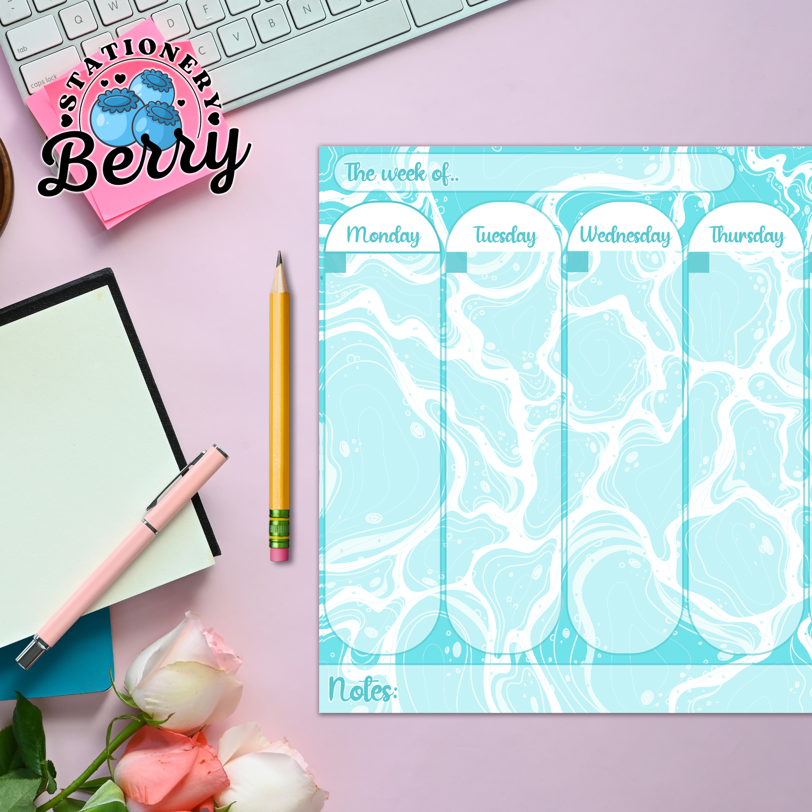 The Salty Seas Weekly Planner Pad features a calming blue Sea-inspired design with spaces for Monday–Sunday, a date area, and a notes section for easy weekly planning.
