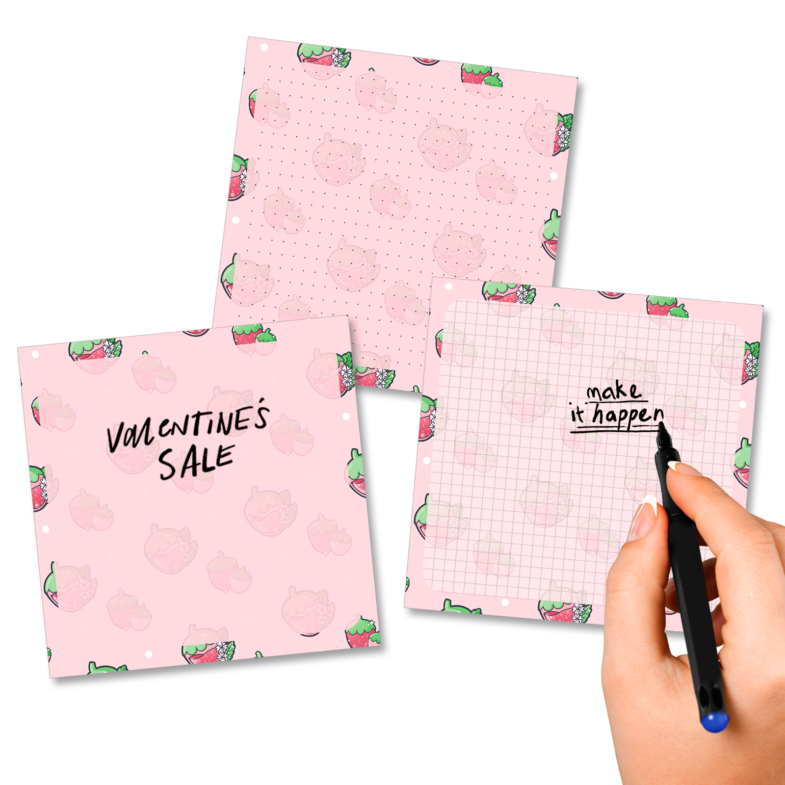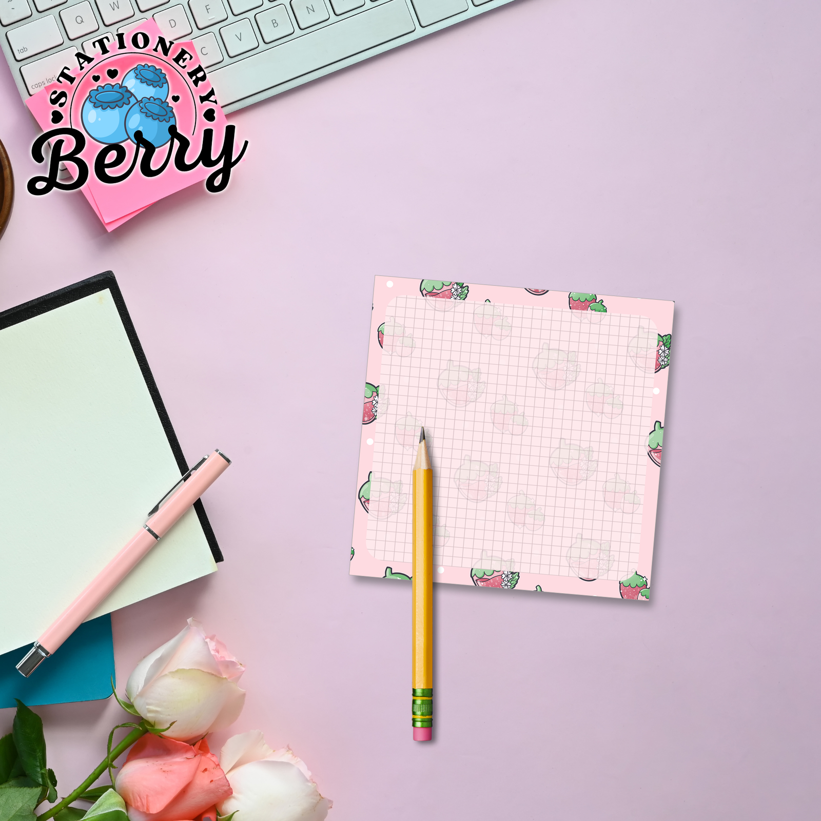 The Sparkle Strawberry Memo Pad is designed for stationery lovers who want playful art without sacrificing function. Measuring a practical 4×4 size, this Memo Pad gives you more writing space than tiny decorative notes while remaining compact enough for desks, planners, and bags. It is available in dots, blank, and grids, or as a bundle of all three, allowing you to choose the format that fits your writing and planning style. The dot layout is perfect for lists and light journaling, the grid layout helps keep notes neat and structured, and the blank layout is ideal for freeform thoughts, doodles, and creative ideas.