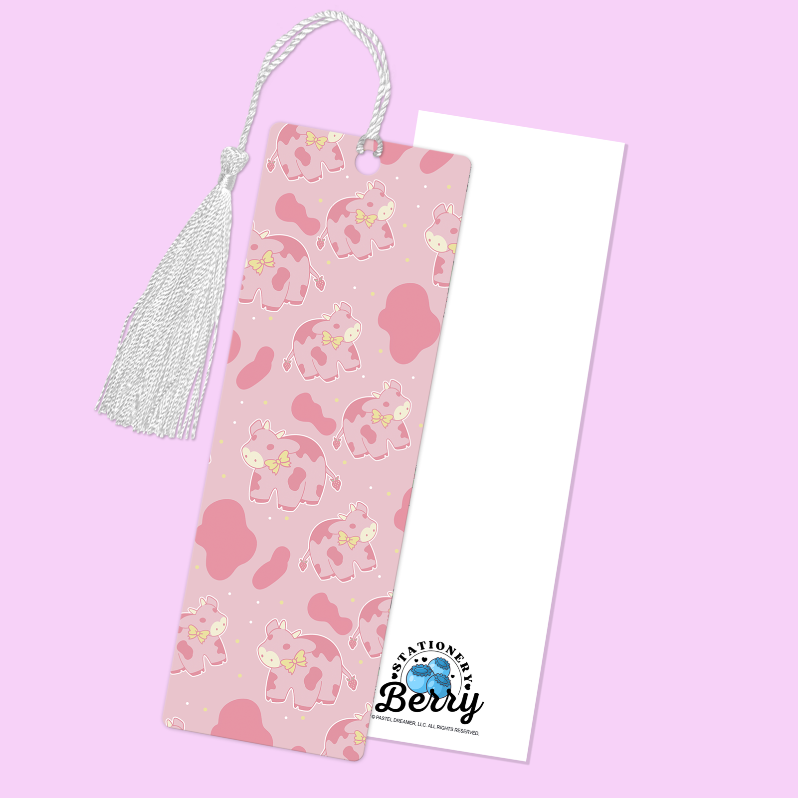 The Strawberry Cow Bookmark is a playful and cozy reading accessory, featuring adorable strawberry milk cows with strawberry cow spots on a pink background, finished with a sweet white tassel.