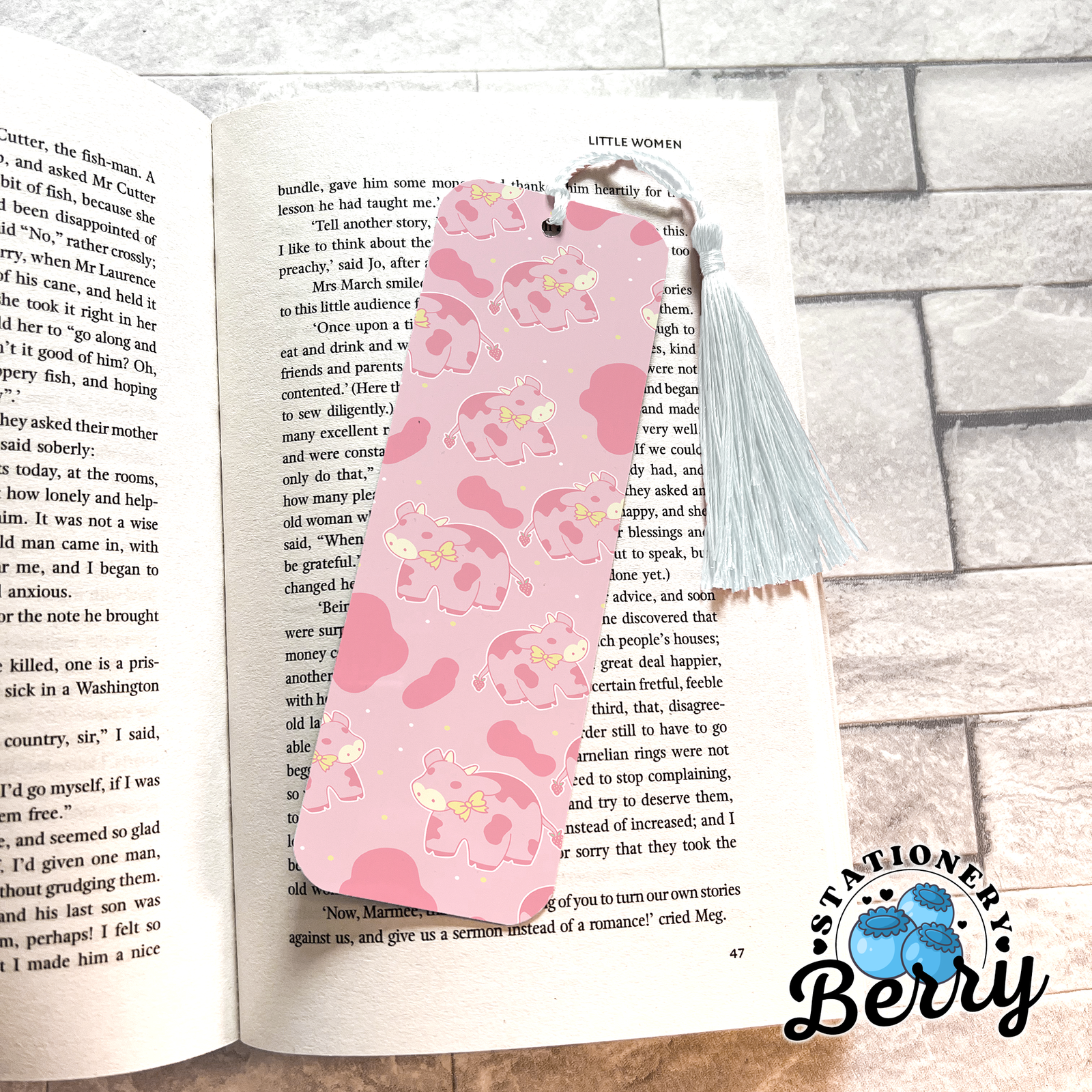Use the Strawberry Cow Bookmark to hold your place in novels, planners, journals, cookbooks, or school books. It slips easily between pages without bending corners or damaging paper, so your books stay neat and organized. Whether you’re curling up with a romance novel, studying for class, or planning your week, the Strawberry Cow Bookmark adds a touch of sweetness to your routine. You can customize it to suit your style with your choice of laminated or holographic sparkle finish, rounded or straight edges, and a tassel or no tassel option.