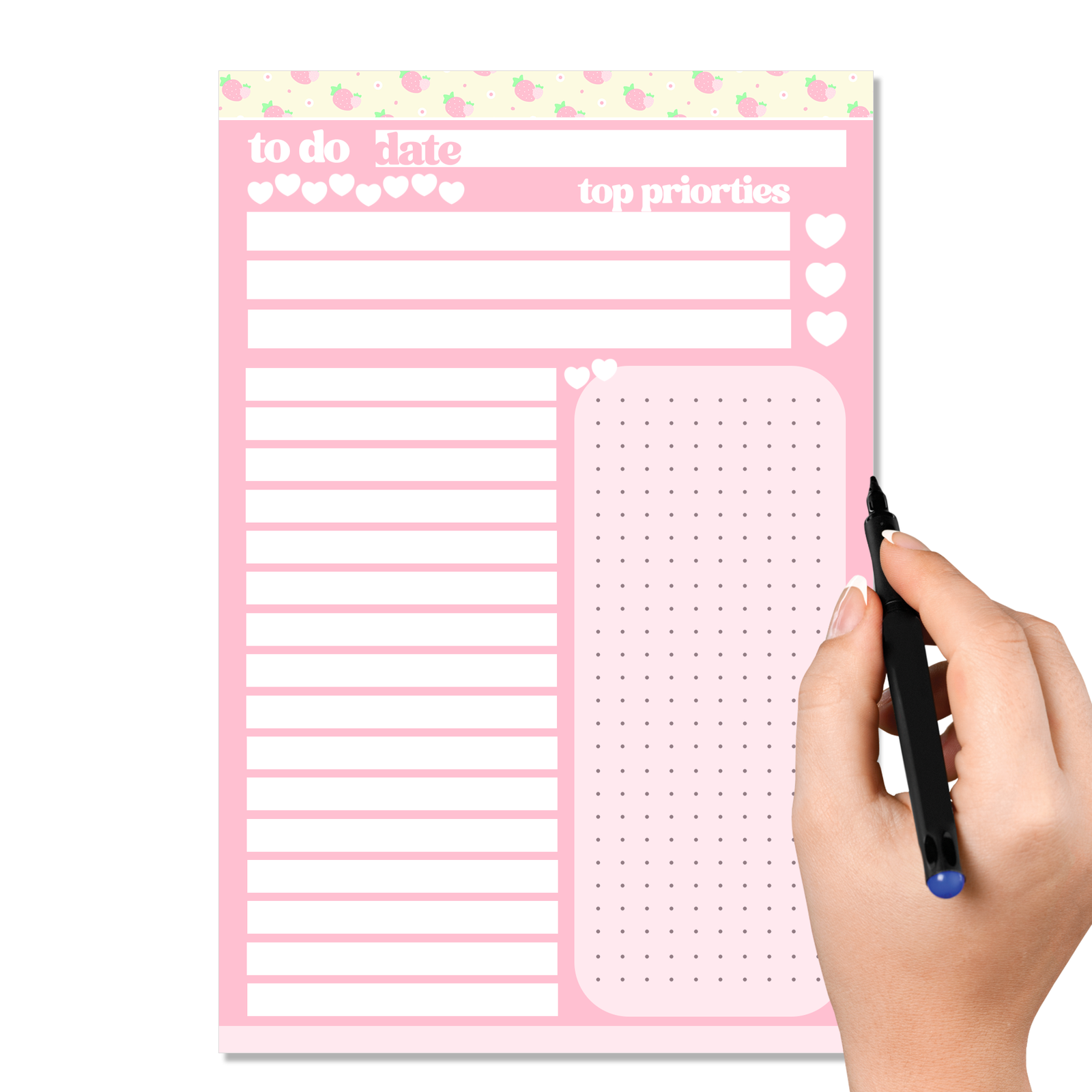 The Strawberry Dreams To Do Pad combines charming Strawberries artwork with a clean and practical layout that helps you stay organized without stress. Each pad includes 40 tear-away sheets and is bound at the top for easy use and smooth removal. Every sheet features a designated date area, three priority sections, a dotted area for custom information, and 16 lined spaces for everything else you need To Do. Set on a soft pink background and topped with a delightful pattern of strawberries and polka dots on a cream-colored header, this design brings warmth and sweetness to your desk, planner, or workspace.
