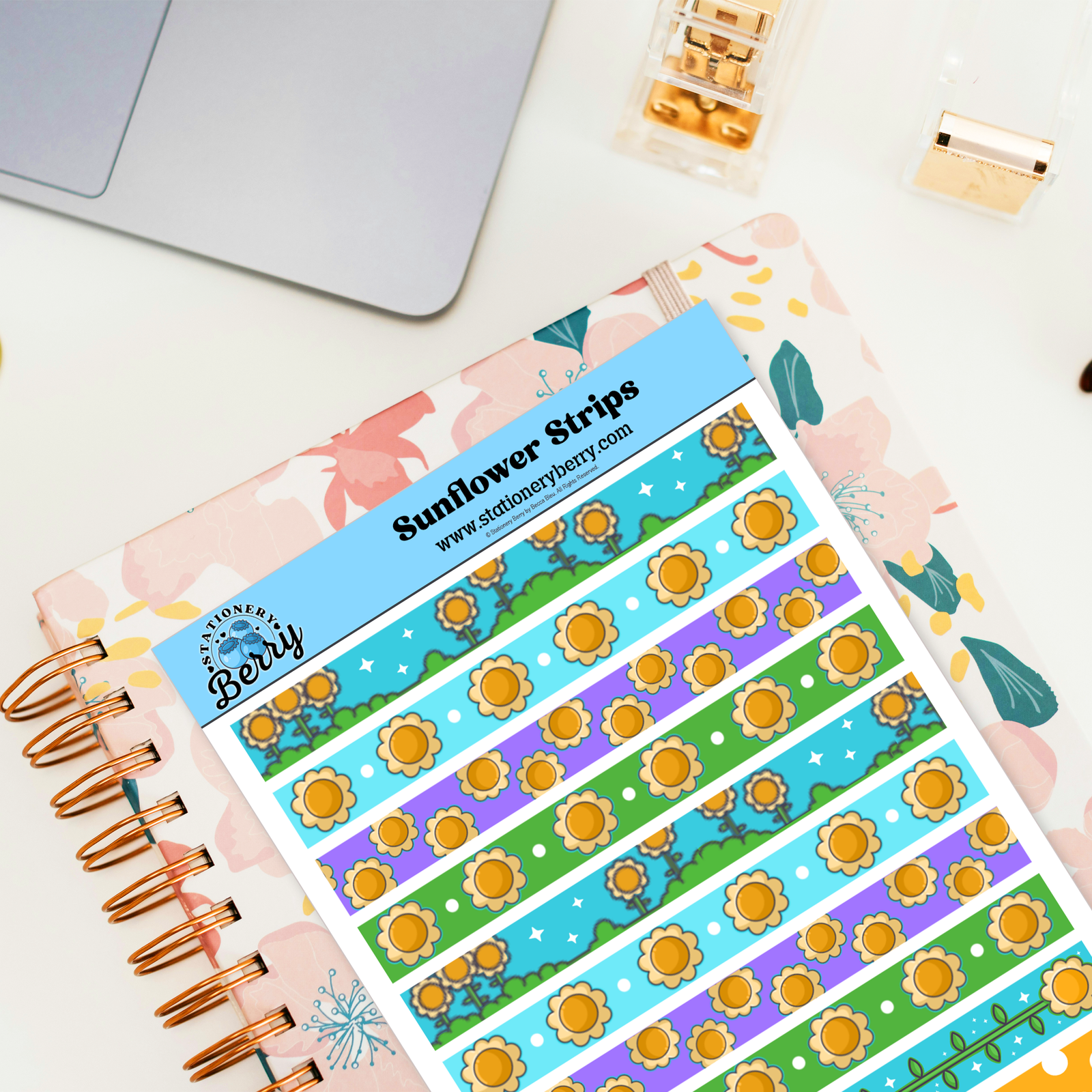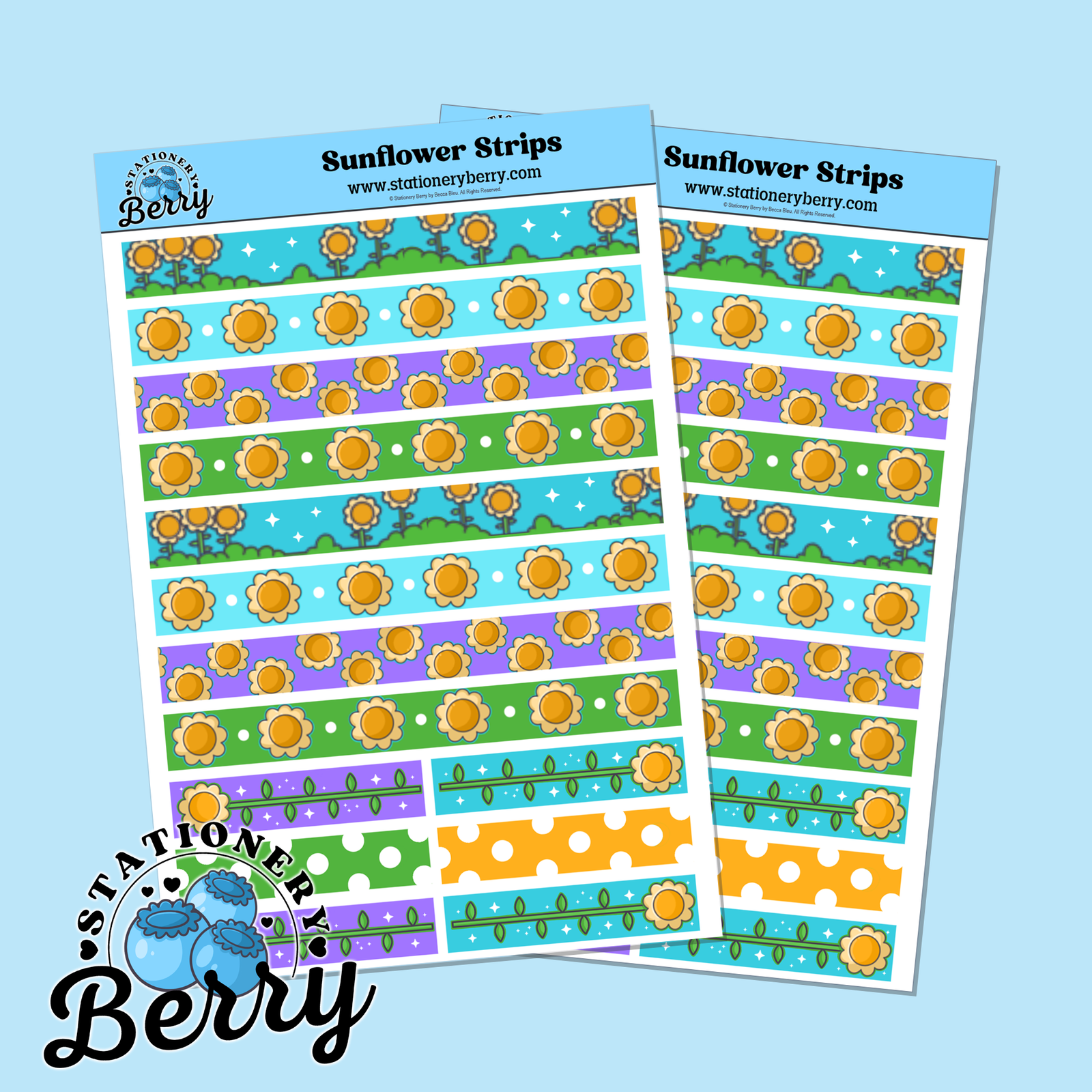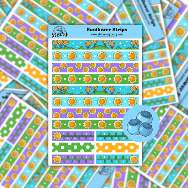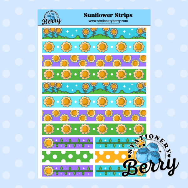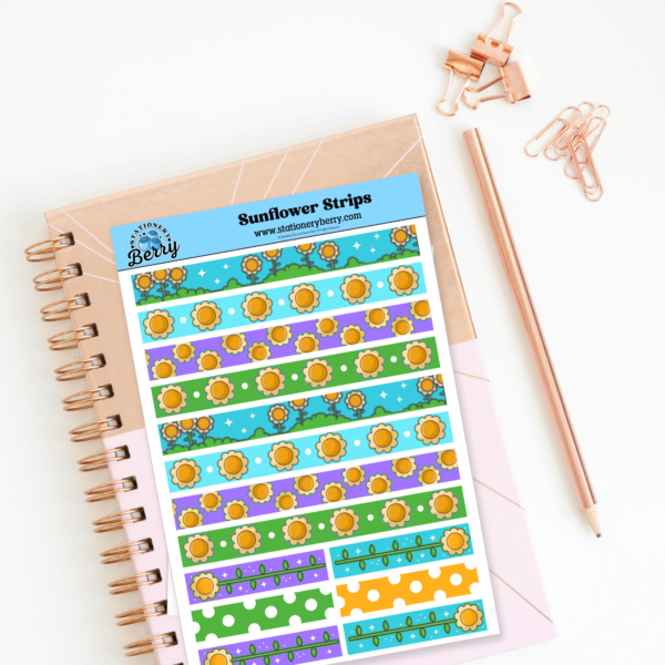 The Sunflower Strips Sticker Sheets feature decorative strips filled with sunflowers for planners and journals. Handmade and bright with floral charm.