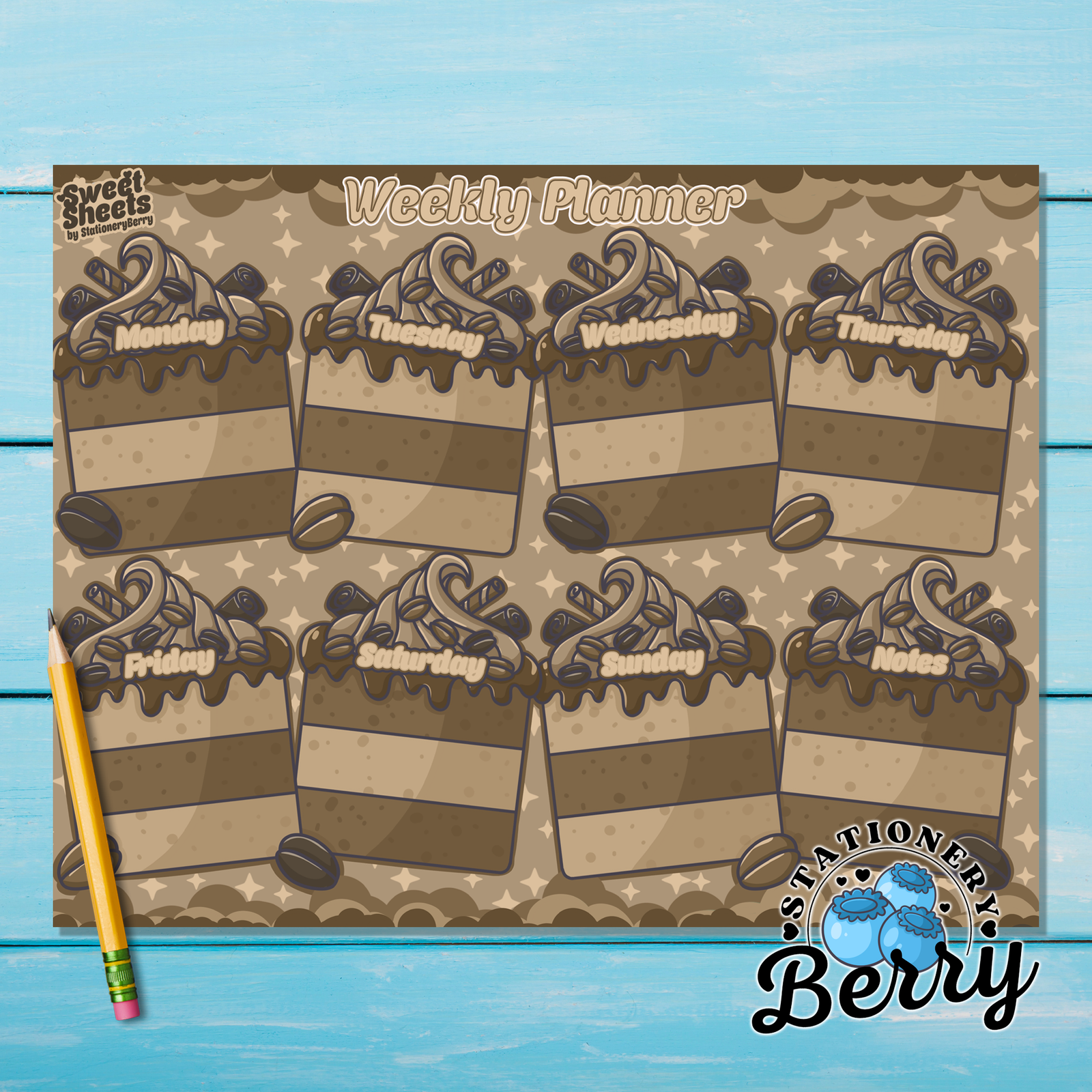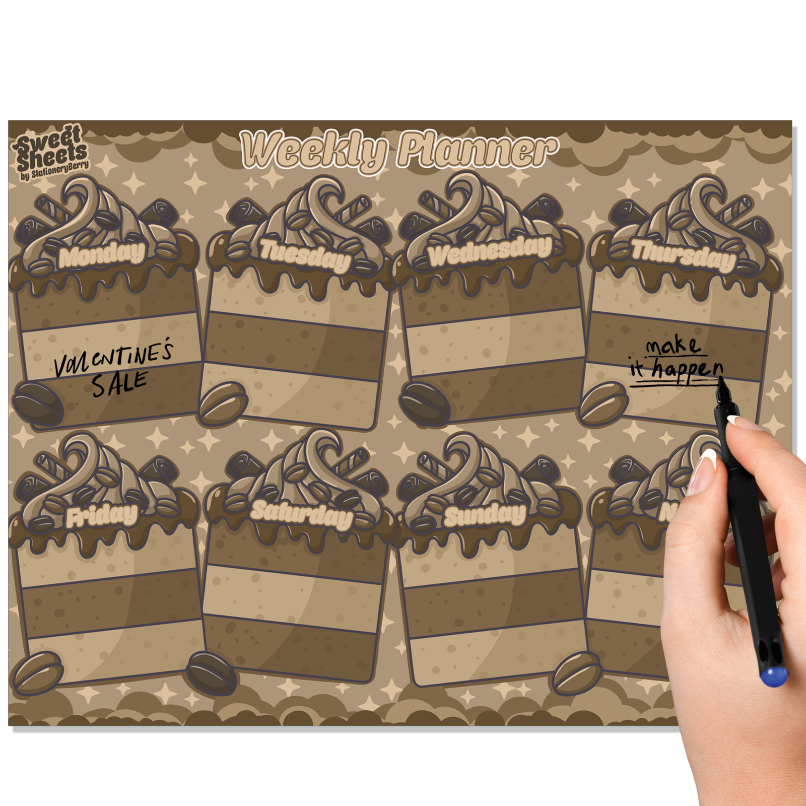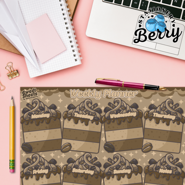 Every Tasty Tiramisu Weekly Planner Pad is entirely hand-drawn by artist Becca Bleu and created exclusively for Stationery Berry. This unique design cannot be found anywhere else, making it both a practical planner and a collectible piece of stationery art. From the original sketches to the final printed pages, each element is thoughtfully crafted to balance beauty with usability.